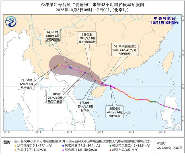 央视网消息:中央气象台10月6日10时继续发布台风蓝色预警和暴雨黄色预警。 中央气象台10月6日10时继续发布台风蓝色预警:今年第21号台风"麦德姆"(热带风暴级)的中心今天(6日)上午8点 钟位于广西崇左市境内,就是北纬21.9度、东经107.3度,最大风力有8级(20米/秒),中心最低气压为995百帕。预 计,"麦德姆"将以每小时15-20公里的速度向西偏北方向移动,将于今天中午前后移入越南北部,强度逐渐减弱。 大风预报:6日14时至7日14时,北部湾、广西南部及沿海、雷州半岛东部沿海将有5-7级、阵风8-9级的大风。 降水预报:6日14时至7日14时,广西西部和南部、贵州西南部、云南东部等地有大到暴雨,其中,广西西部、云南东 南部等地部分地区有大暴雨(100~200毫米)。 今年第21号台风"麦德姆"未来24小时大风预报图 2025年10月6日14时-7日14时 (北京时) 中央气象台 10月6日10时制作 图例 5级 6级 7级 审图号:GS (2019) 3082号 II0 E 防御指南: 中央气象台10月6日10时继续发布暴雨黄色预警:预计,10月6日14时至7日14时,广西西部和南部、贵州西南部 ...