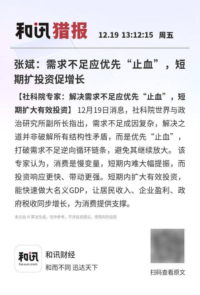 【社科院专家:解决需求不足应优先"止血",短期扩大有效投资】12月19日消息,社科院世界与政治研 究所副所长指出,需求不足成因复杂,解决之道并非破解所有结构性矛盾,而是优先"止血",打破需求 不足逆向循环链条,避免其继续放大。该专家认为,消费是慢变量,短期内难大幅提振,而投资响应更 快、带动更强。短期内扩大有效投资,能快速做大名义GDP,让居民收入、企业盈利、政府税收同步增 长,为消费提供支撑。 本文由 AI 算法生成,仅作参考,不涉投资建议,使用风险自担 本文由 Al 算法生成,仅作参考,不涉投资建议,使用风险自担 和讯财经 和而不同 迅达天下 扫码查看原文 和讯猎报 12.19 13:12:15 周五 张斌:需求不足应优先"止血",短 期扩投资促增长 【社科院专家:解决需求不足应优先"止血",短 期扩大有效投资】 12月19日消息,社科院世界与政 治研究所副所长指出,需求不足成因复杂,解决之 道并非破解所有结构性矛盾,而是优先"止血", 打破需求不足逆向循环链条,避免其继续放大。该 专家认为,消费是慢变量,短期内难大幅提振,而 投资响应更快、带动更强。短期内扩大有效投资, 能快速做大名义GDP,让居民收入 ...
