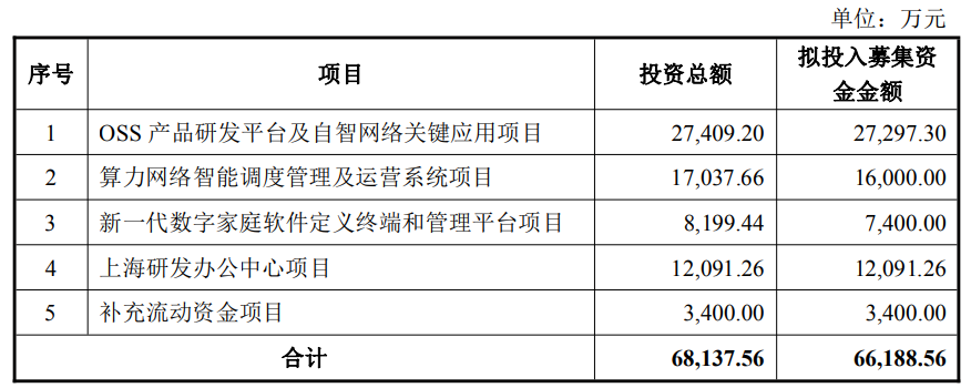 直真科技表示,本次向特定对象发行股票事项尚需中国证监会同意注册后方可实施,最终能否获得中国证监会作出同意注册 的决定及其时间尚存在不确定性。公司将根据该事项进展情况及时履行信息披露义务,请广大投资者注意投资风险。 直真科技11月25日披露向特定对象发行A股股票募集说明书,公司本次发行募集资金总额预计不超过66,188.56万元(含本 数),扣除发行费用后的募集资金净额用于OSS产品研发平台及自智网络关键应用项目、算力网络智能调度管理及运营系统项 目、新一代数字家庭软件定义终端和管理平台项目、上海研发办公中心项目、补充流动资金项目。 | 序号 | 项目 | 投资总额 | 拟投入募集资 金金额 | | --- | --- | --- | --- | | 1 | OSS 产品研发平台及自智网络关键应用项目 | 27.409.20 | 27,297.30 | | 2 | 算力网络智能调度管理及运营系统项目 | 17,037.66 | 16,000.00 | | 3 | 新一代数字家庭软件定义终端和管理平台项目 | 8.199.44 | 7.400.00 | | ব | 上海研发办公中心项目 | 12,091.26 | ...