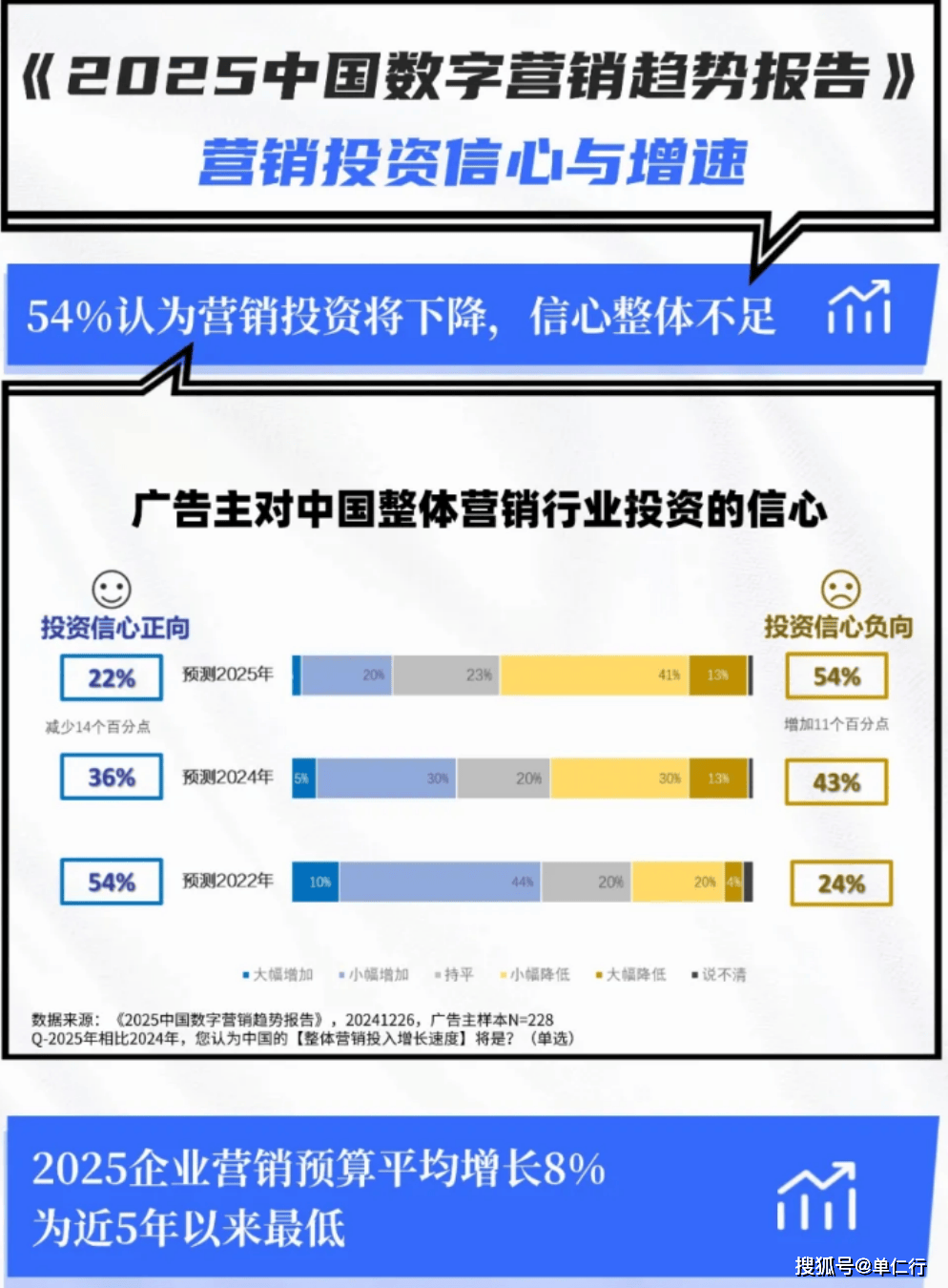01 前两天,我在郑州讲第226届单仁牛商《视播时代,企业全域营销快速增长系统课程》,中间休息的时候,我听到一个新学员抱怨说,不知道为什么最近 广告投放的效果越来越差,想要减少预算。 这让我想到了《2025中国数字营销趋势报告》的一组数据。 2025年,中国企业营销预算的平均增长率只有8%,是五年来的最低水平,有54%的营销人员对市场前景持负面信心,要减少预算。 同时,中国企业的营销,正在上演着一场"人格分裂"。 一方面,当被问到企业增长的首要机会点的时候,有56%的企业选择了"加大品牌建设",位列第一。 也就是说超过一半的企业都认识到,品牌是企业穿越周期、构建护城河的根本。 但另一方面,当被问到如何应对营销预算下降的时候,有53%的企业却做出了完全相反的行动,选择"减少品牌投放,增加效果投放",这个比例比去年增 加了11%。 这不是前后矛盾吗? 为什么明知道品牌更重要,却要减少品牌预算,增加效果投放呢?这种做法是对的吗? 02 其实,我特别能理解这种认知与行动的矛盾。 一方面来自于现实带来的压力。 尽管我们都知道中国是全球最大的单一消费市场,像汽车、奢侈品消费都是全球第一,但实际上关上门来说,今天国内需求依 ...
