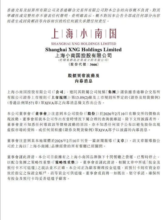 公司股价波动与澄清公告 - 公司股份于2026年2月10日在联交所的价格出现波动 [1] - 公司澄清某本地媒体关于“上海小南国”品牌所有餐厅已关闭的报道不准确 [1] - 公司澄清相关文章中“按金及预付卡不可退还”的说法不正确 公司正为顾客办理按金退还 预付卡资金存放于指定保证金账户可供退还 [1] 上海小南国品牌餐厅运营现状 - 公司目前拥有的上海小南国品牌旗下十间餐厅的营运已暂时停止 [1] - 暂停营运是为了配合集团的策略性重整 [1] 策略性重整的背景与目的 - 策略重整是集团持续进行的投资组合重组的一部分 旨在精简营运及重新分配资源至核心市场 [2] - 暂停营运反映中国内地餐饮业务持续缺乏盈利能力 旨在减少于艰难营商环境下的财务亏损 [2] - 此举是更广泛计划的一环 预期可提升营运效率 改善产品及服务品质并降低成本 [2] 未来资源分配与业务规划 - 营运资源将策略性地重新分配至更具盈利能力的市场板块 以把握可持续增长的机遇 [2] - 集团将专注于提升资源分配效率 并推行涵盖全面业务重整的品牌重塑计划 [2] - 目标是提升可负担性 加强利润率 并建立更具活力及更易于接触的品牌形象 以契合不断演变的消费者偏好 [2] 董事会立场 - 董事会认为策略性重整符合集团及其股东的最佳利益 [2] - 董事会成员将坚守承诺 确保所有按金及预付卡均妥善退还予顾客 [1]