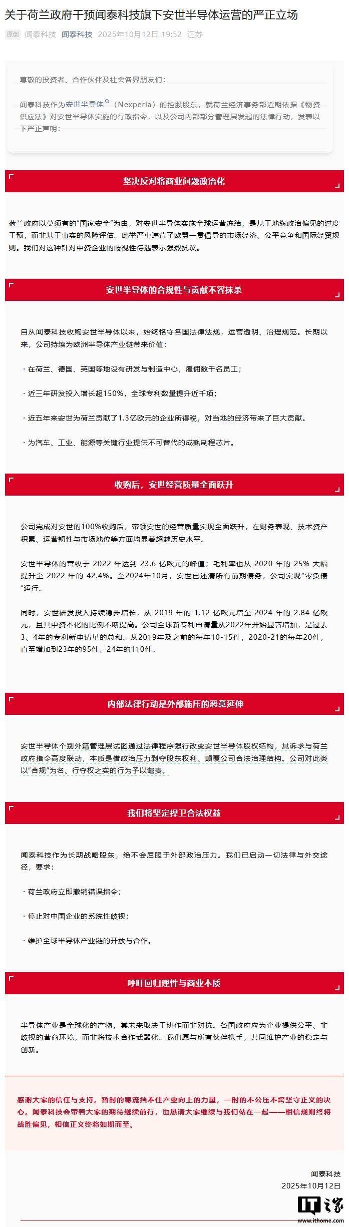 事件核心观点 - 闻泰科技发表声明,谴责荷兰政府以“国家安全”为由冻结其控股子公司安世半导体的全球运营,认为此举违背市场经济原则并构成歧视性待遇 [1][2] - 公司同时谴责安世半导体个别外籍管理层试图通过法律程序改变股权结构,认为这是借助外部政治压力剥夺股东权利的行为 [1][4] - 公司表示将坚定捍卫合法权益,已启动法律与外交途径,并呼吁回归商业本质 [1][5][6] 荷兰政府行动与管理层法律挑战 - 荷兰政府于9月30日依据《物资供应法》对安世半导体发出行政指令,要求冻结其对资产、知识产权等的调整,为期一年 [20] - 安世半导体部分外籍高管要求闻泰科技转让股权,并要求暂停闻泰科技委派的CEO职务 [20] - 荷兰企业法院已生效紧急措施,暂停了张学政作为安世半导体CEO的职务和职权 [20] 安世半导体经营与财务表现 - 公司完成对安世半导体的100%收购后,其经营质量全面跃升 [3][13] - 安世半导体营收于2022年达到23.6亿欧元的峰值,毛利率从2020年的25%大幅提升至2022年的42.4% [3][14] - 至2024年10月,安世半导体已还清所有前期债务,实现“零负债”运行 [3][14] - 安世半导体2024年收入规模约为147亿元人民币 [20] 研发投入与知识产权 - 安世半导体研发投入持续稳步增长,从2019年的1.12亿欧元增至2024年的2.84亿欧元 [3][14] - 近三年研发投入增长超过150% [5][11] - 全球新专利申请量显著增加,从2019年及之前的每年10-15件,增至2023年的95件和2024年的110件 [3][14] - 近三年全球专利数量提升近千项 [5][11] 公司对当地经济的贡献与产业角色 - 安世半导体在荷兰、德国、英国等地设有研发与制造中心,雇佣数千名员工 [5][11] - 近五年来为荷兰贡献了1.3亿欧元的企业所得税 [5][11] - 公司为汽车、工业、能源等关键行业提供不可替代的成熟制程芯片 [5][12] 公司立场与行动 - 闻泰科技坚决反对将商业问题政治化,认为荷兰政府的指令是基于地缘政治偏见的过度干预 [2] - 公司已启动一切法律与外交途径,要求荷兰政府撤销指令、停止对中国企业的系统性歧视、维护全球半导体产业链的开放与合作 [5][10] - 公司呼吁各国政府提供公平、非歧视的营商环境,强调半导体产业的未来取决于协作而非对抗 [6]