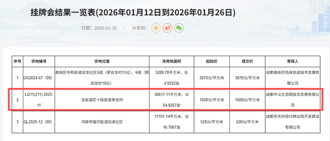 地块成交核心信息 - 成都高新区陆肖轨道城市发展有限公司以起始价3870元/平方米竞得高新区中和街道一宗净用地面积约4.93亩的地块[2] - 成都中法生态园投资发展有限公司以起始价1508元/平方米竞得龙泉驿区十陵街道一宗净用地面积约54.93亩的商业用地[2] - 成都市天府现代种业园开发建设有限公司以起始价528元/平方米竞得邛崃市临邛街道一宗净用地面积约16.79亩的地块[2] 龙泉驿区十陵地块详情与规划 - 该地块为十陵板块首宗出让的商业用地,面积约55亩,容积率约2.48,成交楼面价1508元/平方米[3] - 地块位置优越,紧邻规划中的范家院子TOD,周边住宅小区密集,常住人口增长显著,商业需求旺盛[3] - 根据出让文件,竞得人须建设计容建筑面积不低于6.5万平方米的区域商业综合体,聚焦购物、餐饮、娱乐与街区商业,项目总投资不得低于9亿元[6] - 地块须统一开发运营,不得变更用途[6] 竞得人背景与项目计划 - 竞得人成都中法生态园投资发展有限公司为龙泉驿区国有资本控股企业,成立于2018年12月,注册资本金约58亿元[3][9] - 该公司由成都经开产投(占股约88.46%)和成都经开信融(占股约11.54%)共同控股[9] - 2025年1月,该公司曾发布招标计划,拟投资120亿元建设一座总建筑面积约14万平方米的商业综合体,包含购物中心、商业街区、精品酒店等业态[6][8] - 该招标计划的设计、勘察等招标内容预计于2026年2月进行[8] 区域商业影响与展望 - 十陵板块长期缺乏大型商业中心,本次综合体的落地将有力填补区域商业空白[5] - 该地块东侧尚有约34亩商业用地待出让,市场猜测其可能与本次地块共同构成完整的商业综合体项目[9] - 此项商业综合体的落地将显著提升区域城市功能与商业能级,为城东商业发展格局注入新的活力[11]