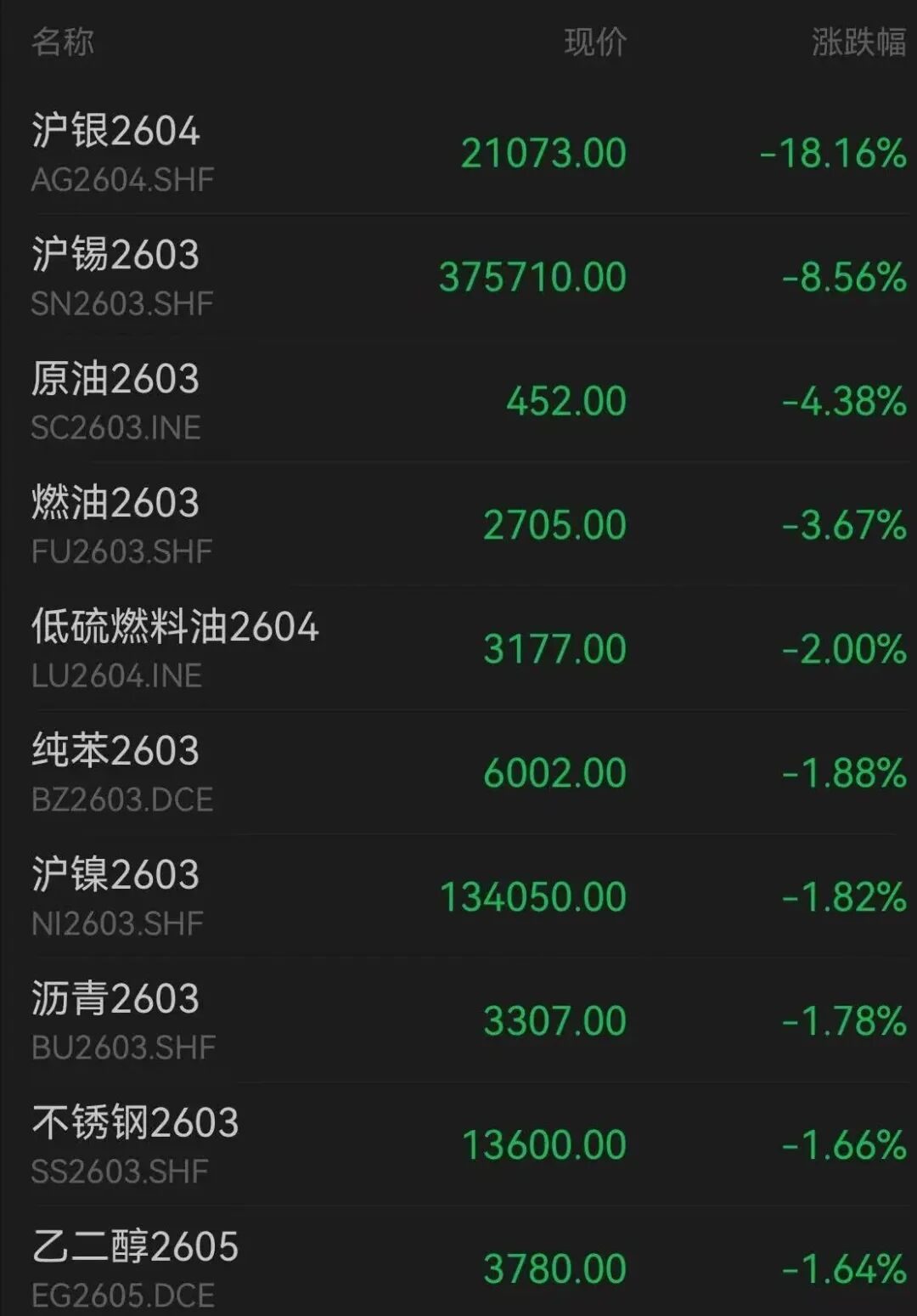 商品期货市场开盘表现 - 2月6日国内商品期货早盘开盘多数下跌,沪银跌幅近17%,铂跌幅超11%,碳酸锂跌幅超6%,沪锡跌幅近6%,沪金跌幅超4%,玻璃、焦煤、铁矿石、棉纱等品种小幅下跌 [1] 主要商品期货品种具体价格与跌幅 - 沪银2604现价18387.00,跌幅达16.78% [2] - 铂2606现价483.40,跌幅达11.92% [2] - 碳酸锂2605现价128400.00,跌幅达6.09% [2] - 沪锡2603现价357290.00,跌幅达5.79% [2] - 沪金2604现价1062.74,跌幅达4.48% [2] - 烧碱2603现价1869.00,跌幅达3.81% [2] - 多晶硅2605现价48320.00,跌幅达3.76% [2] - 沪铜2603现价99690.00,跌幅达2.74% [2] - 国际铜2603现价88340.00,跌幅达2.74% [2]