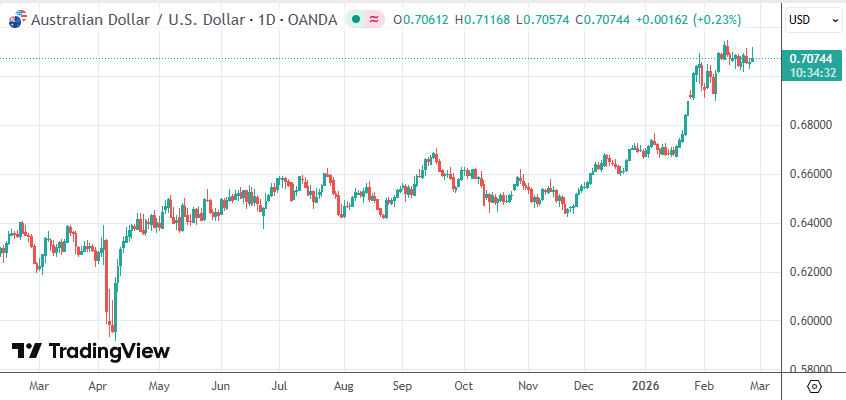 澳元兑美元汇率表现 - 2026年2月26日亚洲早盘,澳元兑美元汇价交投于0.7129,日内上涨0.0010,涨幅0.0842% [1] - 2026年初至今,澳元累计升值6.2%,在主要货币中表现突出 [1] 澳元走强核心驱动因素 - 澳大利亚1月CPI同比为3.8%,与12月持平且超预期,核心CPI升至3.4%,持续超出2%-3%的政策目标 [1] - 澳央行于2月3日加息25个基点至3.85%,成为2026年首个加息的发达经济体央行,强化了市场鹰派预期 [1] - 市场目前预计澳央行5月加息概率为70%,年末利率可能达到4.2%,这为澳元提供了支撑 [1] - 作为商品货币,澳元受益于工业金属、贵金属价格上涨以及铁矿石出货量创新高 [1] - 美元因市场预期美联储在2026年可能降息两次而持续承压,为澳元升值创造了空间 [1] 影响澳元的外部环境因素 - 中国内需复苏以及中美贸易关系的演变,是影响澳元走势的重要外部因素 [1] 澳元上行制约因素 - 澳大利亚1月消费者信心指数为92.9点,处于悲观区间,家庭对加息敏感可能抑制内需 [1] - 澳央行在制定政策时需要兼顾经济增长与就业,当前失业率为4.1%,这限制了其加息空间 [1] - 技术面上,汇价在0.7157阻力位遇阻,下方支撑位在0.7013,需突破阻力位才能打开上行空间 [1] 短期市场关注焦点 - 市场将重点关注美国初请失业金人数、美联储官员表态以及大宗商品价格 [2] - 美国经济数据走弱可能助推澳元,而美联储的鹰派表态可能在短期内压制澳元 [2] - 同时需要跟踪澳央行的政策信号、澳大利亚国内通胀数据以及中国经济动态 [2] 短期市场展望 - 综合来看,澳元短期强势明确,通胀、加息预期及商品价格上涨构成支撑 [2] - 但消费疲软、加息空间有限及技术阻力位制约了其上行空间 [2] - 短期大概率将维持强势震荡格局 [2]