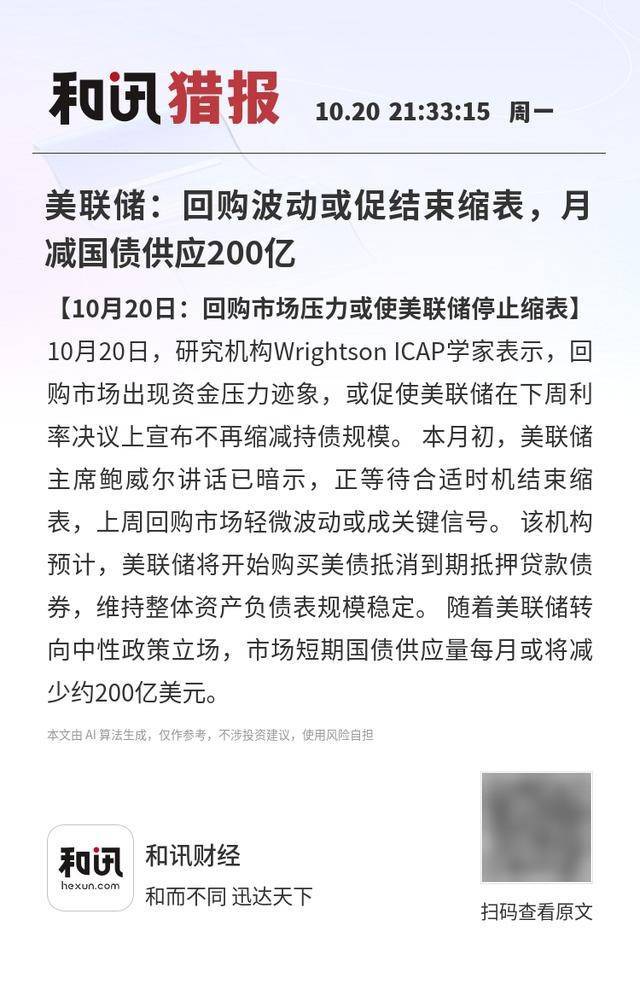 美联储:回购波动或促结束缩表,月 减国债供应200亿 本文由 AI 算法生成,仅作参考,不涉投资建议,使用风险自担 和讯猎报 10.20 21:33:15 周- 【10月20日:回购市场压力或使美联储停止缩表】10月20日,研究机构Wrightson ICAP学家表示,回购 市场出现资金压力迹象,或促使美联储在下周利率决议上宣布不再缩减持债规模。 本月初,美联储主 席鲍威尔讲话已暗示,正等待合适时机结束缩表,上周回购市场轻微波动或成关键信号。 该机构预 计,美联储将开始购买美债抵消到期抵押贷款债券,维持整体资产负债表规模稳定。 随着美联储转向 中性政策立场,市场短期国债供应量每月或将减少约200亿美元。 【10月20日:回购市场压力或使美联储停止缩表】 10月20日,研究机构Wrightson ICAP学家表示,回 购市场出现资金压力迹象,或促使美联储在下周利 率决议上宣布不再缩减持债规模。本月初,美联储 主席鲍威尔讲话已暗示,正等待合适时机结束缩 表,上周回购市场轻微波动或成关键信号。 该机构 预计,美联储将开始购买美债抵消到期抵押贷款债 券,维持整体资产负债表规模稳定。随着美联储转 向中性政策立场,市场短 ...