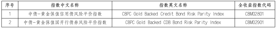 | 序号 | 指数中文名称 | 指数英文名称 | 全收益指数代码 | | --- | --- | --- | --- | | | 中债-黄金保值信用债风险平价指数 | CBPC Gold Backed Credit Bond Risk Parity Index | CBM02801 | | | 中债-黄金保值国开行债券风险平价指数 | CBPC Gold Backed CDB Bond Risk Parity Index | CBM02901 | 上述指数基期为2015年12月31日,基点为1000。截至2025年11月28日,中债-黄金保值信用债风险平价指数近5年年化收益率为 5.14%,年化波动率为1.27%, | 序号 | 指数中文名称 | 年化收益率 | 年化波动率 | 夏普比率 | 卡玛比率 | 最大回撤 | | --- | --- | --- | --- | --- | --- | --- | | | 中债-黄金保值信用债风险平价指数 | 5.14% | 1.27% | 2.56 | 3.12 | 1.65% | | | 中债-黄金保值国开行债券风险平价指数 | 4.46% | 1.23% | 2 ...