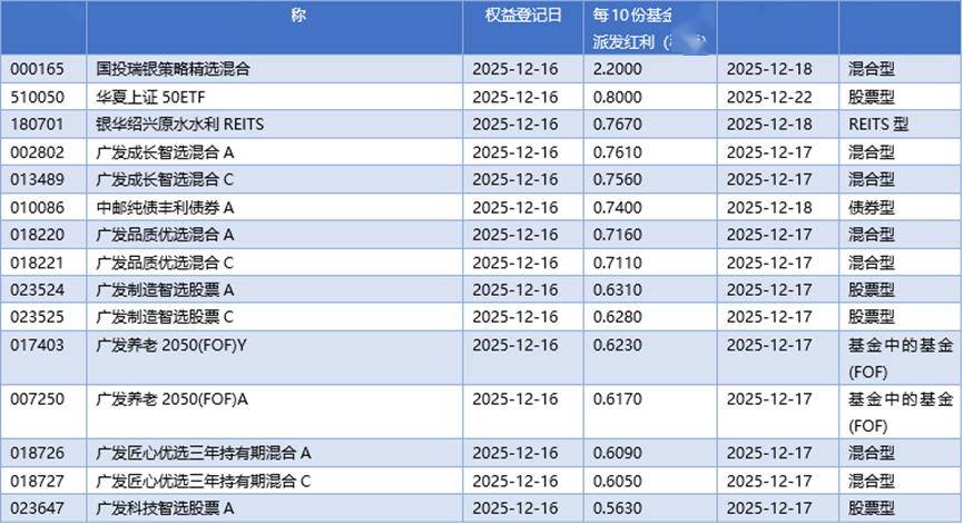 一、交易提示 数据显示,截至12月15日,境内ETF总规模达5.74万亿元,较年初增加逾2万亿元,增幅53%。其中,7月集中上市的科创债 ETF成为最大"吸金王",挂钩AAA科创债指数的同类产品年内规模激增超2000亿元,位居全市场第一。伴随细分品类扩 容,ETF生态由"宽基独大"转向"多资产均衡",行业竞争也从费率、牌照的"跑马圈地"升级为品牌、服务与生态体系的"精 耕细作"。 | | | 权益等记日 | 每10份基 | | | | --- | --- | --- | --- | --- | --- | | | | | 派发红利( | a | | | 000165 | 国投瑞银策略精选混合 | 2025-12-16 | 2.2000 | 2025-12-18 | 温合型 | | 510050 | 华夏上证 50ETF | 2025-12-16 | 0.8000 | 2025-12-22 | និង គឺ គឺនិងត្ | | 180701 | 银华绍兴原水水利 REITS | 2025-12-16 | 0.7670 | 2025-12-18 | REITS 型 | | 002802 | 广发成长智选晨合 ...