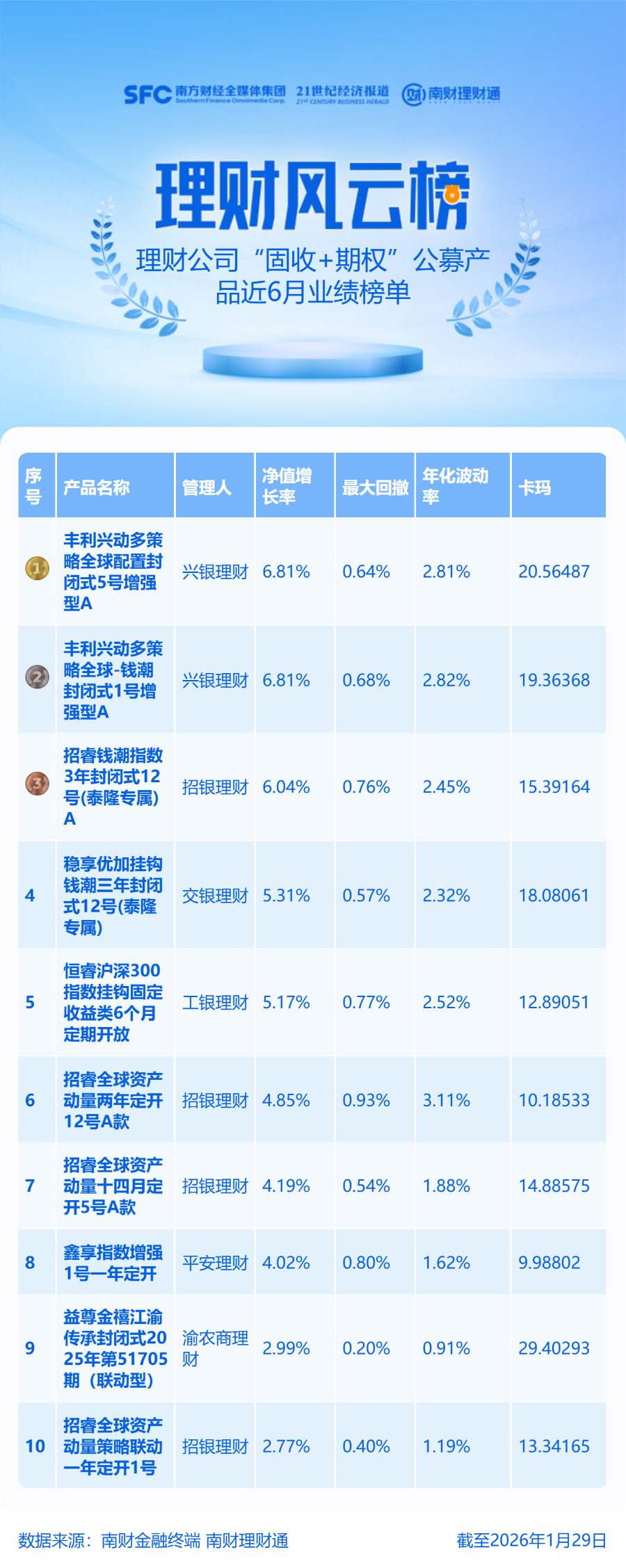 整体市场表现 - 截至2026年1月29日,理财公司共存续157只成立时间在6个月以上的公募“固收+期权”理财产品,近6个月平均净值增长率为3.33%,平均最大回撤为0.42% [5] - 收益前十榜单中,招银理财有4只产品上榜,兴银理财有2只产品上榜,交银理财、平安理财、渝农商理财和工银理财各有1只产品上榜 [5] 头部产品业绩 - 兴银理财两款产品“丰利兴动多策略全球配置封闭式5号增强型A”和“丰利兴动多策略全球-钱潮封闭式1号增强型A”近6月净值涨幅均为6.81%,位列榜单冠亚军 [3][5] - 招银理财“招睿钱潮指数3年封闭式12号(泰隆专属)A”近6月净值增长率为6.04%,位列第三 [3][5] - 交银理财“稳享优加挂钩钱潮三年封闭式12号(泰隆专属)”近6月净值增长率为5.31%,位列第四 [4] - 工银理财“恒睿挂钩沪深300看涨或者固定收益类6个月定期开放”近6月净值增长率为5.17%,位列第五 [4] 其他上榜产品业绩 - 招银理财“招睿全球资产动量两年定开12号A款”近6月净值增长率为4.85% [4] - 招银理财“招睿全球资产动量十四月定开5号A款”近6月净值增长率为4.19% [4] - 平安理财“鑫享指数增强1号一年定开”近6月净值增长率为4.02% [4] - 渝农商理财“益尊金禧江渝传承封闭式2025年第51705期(联动型)”近6月净值增长率为2.99%,位列第九 [4][5] - 招银理财“招睿全球动量策略联动年度开1号”近6月净值增长率为2.77%,位列第十 [4] 产品风险与波动指标 - 榜单产品近6月最大回撤范围在0.20%至0.93%之间,年化波动率范围在0.91%至3.11%之间 [3][4] - 渝农商理财上榜产品风险评级为二级,其卡玛比率高达29.40293,为榜单最高 [4][6] 产品结构与投资标的分析 - 渝农商理财上榜产品“益尊金禧江渝传承封闭式2025年第51705期(联动型)”成立于2025年7月15日,预计2027年1月14日到期,截至2025年末存续份额为3999.19万份 [6] - 该产品持仓结构为:券商收益凭证占比约40%,债券占比约37%,现金及银行存款占比约23% [6] - 该产品所投券商收益凭证的关联标的为“申万睿衍中国多资产智能配置指数2.0”,业绩比较基准为1.20%至4.90% [6] - 截至2025年2月4日,“申万睿衍中国多资产智能配置指数2.0”近1年年化涨幅为8.32% [7] 同系列产品表现分化 - 渝农商理财同系列产品“益尊金禧江渝传承封闭式2025年第51703期(联动型)”近6月净值涨幅仅0.4%,表现垫底 [6] - 该产品成立于2025年6月17日,预计2026年12月17日到期,截至2025年末存续规模为9784.03万份 [7] - 其持仓结构为:券商收益凭证占比约40%,债券占比54.46%,现金及银行存款占比不足4% [7] - 该产品所投券商收益凭证的关联标的为“国泰君安全天候指数2.0”,业绩比较基准同为1.20%至4.90% [7] - 截至2025年2月4日,“国泰君安全天候指数2.0”近1年微跌0.15%,与另一指数表现的显著差异是导致同系列产品收益分化的重要原因 [7]