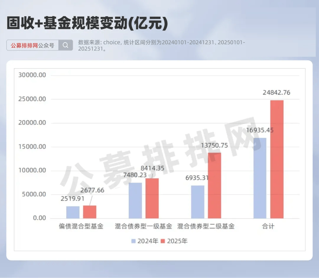 市场背景与核心观点 - 2025年权益市场表现火热,部分主要宽基指数涨幅超过50%,部分主题指数涨幅超过100% [1] - 在此背景下,投资者对“求稳收益”的追求愈发强烈,导致“固收+”基金凭借较稳的回撤控制与增强收益弹性,其规模扩容速度远超权益基金 [1] - 截至2025年末,“固收+”基金规模已达2.48万亿元,同比增速为46.69%,反映出居民及机构在低利率与权益市场波动加大环境下对“求稳收益+低波动”资产的强烈配置需求 [1][5] 重视“固收+”基金的原因 - 低利率背景下,传统理财收益走低,无论是定期存款、货币基金还是短债基金,其收益率均难以满足投资者对资产求稳增值的需求 [3] - 对于机构投资者而言,纯债基金也因票息变薄和债市波动加剧,难以完成投资目标 [3] - “固收+”策略以债券资产作为底仓,通过精选股票等权益资产做增强,构建了风险收益比较优的投资组合 [4] - 相较于纯债基金,“固收+”基金具备更高的收益弹性;相较于纯股票基金,其风险和波动较低,持有体验较好 [4] - 市场需求印证其契合当下行情,2025年同比46.69%的增速是市场对其需求的热烈反响 [5] “固收+”基金的类型与定义 - 市场对“固收+”基金没有明确定义,但从监管口径及市场情况来看,主要指以纯债资产打底,权益仓位在5%—30%的基金产品 [7] - 权益仓位包含股票、可转债及股票型基金等权益资产,避免突破30%的红线 [7] - 部分偏债的灵活配置型基金也可以算在“固收+”基金的行列 [8] - 根据权益类资产仓位可进一步划分:权益仓位在10%以下为低波产品,10%-20%之间为中波产品,20%以上为高波产品 [11] “固收+”基金的主要类别与特点 - **一级债基**:主要投资于债券,不投资股票,但可投资可转债,其优势在于波动通常小于二级债基,并有追求超额收益的能力 [9] - **二级债基**:债券配置≥80%,股票配置≤20%,是“固收+”的经典代表,长期风险收益性价比比较高,可通过资产配置降低组合风险 [9] - **可转债基金**:主要投资于可转换债券,部分产品也可少量投资股票,其优势在于股市向好时可通过转股期权分享上涨收益,股市下跌时有债券利息收益作为安全垫 [9] - **偏债混合型基金**:主投债券和股票,股票仓位上限通常为30%,在资产配置上灵活度较高,风险收益比通常高于债基 [9] - **灵活配置型基金(偏债)**:资产配置更灵活,偏债型产品的股票仓位范围也较广,其优势在于灵活性较高,可在市场不同阶段通过大幅调整组合,追求较佳风险收益比 [9] 筛选绩优“固收+”基金的核心指标 - **年化波动率**:较低的年化波动率代表基金净值波动较小,走势更为平稳,是衡量稳定性的关键指标 [14] - **成立以来最大回撤**:考验基金在极端行情下的风险控制能力,绩优产品通常会将其控制在较低水平(例如-5%以内) [14] - **权益仓位配比**:权益仓位是基金波动的主要来源,一般仓位越高,基金潜在的收益弹性与波动风险通常也越大 [14] - **卡玛比率**:综合评估风险收益比的关键指标,比率越高,说明基金在风险控制的基础上创造超额收益的能力越强,投资性价比也越高 [15] 不同波动类型绩优产品的筛选逻辑 - **低波绩优产品**:权益占基金资产净值比<10%、成立以来最大回撤<5%、年化波动率<5%、卡玛比率>1,剔除成立不满一年的基金 [17] - **中波绩优产品**:权益占基金资产净值比处于10%-20%区间、成立以来最大回撤<5%、年化波动率<7.5%、卡玛比率>1,剔除成立不满一年的基金 [17] - **高波绩优产品**:权益占基金资产净值比处于20%-30%区间、成立以来最大回撤<5%、年化波动率<10%、卡玛比率>1,剔除成立不满一年的基金 [17]