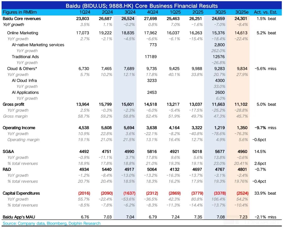 百度三季度业绩于 2025 年 11 月 18 日港股盘后放出,整体看符合预期,通过详细披露 AI 收入的动作,看的出来公司急切想撕掉传统标签、全面开讲 AI 新故事的决心。 具体来看(只讨论百度核心): 1. AI 收入贡献占比已达 40%:三季度,直接与 AI 相关的收入实现近 100 亿,这已经达到总营收的 40%。其中: (1)AI 云基础(包含大模型 API、算力租赁)占了一半,同比增速 33%,由于已经单拎出 AI 部分,因此这个增速实际并不算惊艳。其中变化较大的是 算力租赁,本季度增速 128%,相比上季度的 50% 明显加速。 海豚君认为一方面是行业 AI 渗透提高,中小企业尤其是下游应用方的转型需求;另一方面也可能包含一些原先自供算力的巨头在本季度贡献的需求。 这里看电话会管理层解释,若存在后者,那么未来也不排除这里的需求重新迁移回去,若行业渗透率没有继续加深的化,那么对百度而言,本季度可能就 属于偏一次性的加速。 (2)AI 应用 26 亿,同比增速 6%,主要包括百度文库、百度网盘、数字员工等。尽管也是隶属于 AI+,但增速较低,海豚君预计主要是百度网盘(本季 度促销减免)以及其他杂项的 ...