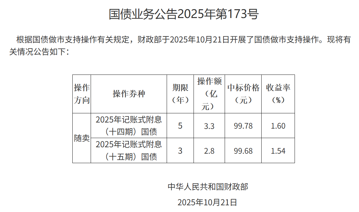 财政部:为支持国债做市,提高国债二级市场流动性,健全反映市场供求关系的国债收益率曲线,财政部决定开展国债做市支持操作