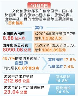 | TOERE | | | --- | --- | | 文化和旅游部发布信息显示,国庆中 | | | 秋假期,国内旅游出游人数、旅游花费、 | | | 出游半径、目的地游憩半径等主要指标创 | | | 下历史新高。 | | | 直中 | | | 全国国内出游 | 较2024年国庆节假日7天 | | 8.88亿人次 | 增加1.23亿人次 | | 国内出游总花费 | 较2024年国庆节假日7天 | | 8090.06 亿元 | 增加1081.89亿元 | | 45.7%的受访者选择了 | 高铁出游 17.5% | | 自驾游 | | | 同比增长6.8个百分点 | 飞机出游 7.4% | | 游客平均出游半径 | 回比增长 | | 212.66 公里 | 14.8% | | 游客目的地平均选题半径 | 同比增长 | | 23.04 公里 | 24.5% | (原标题:时报数说 国庆中秋假期 国内出游总花费超8000亿) ...