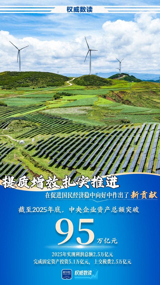 2025年实现利润总额2.5万亿元 完成固定资产投资5.1万亿元,上交税费2.5万亿元 权威数读 / 制非版 科技包新特集强化 在推进高水平科技自立自强中实现了新突破 2025年,中央企业研发投入 __ 万亿元 连续四年超过万亿元 新增22位两院院士、创历史最好水平 23个创新联合体新吸纳超过100家创新主体参与攻关 在前沿领域实现一系列突破 权威数读 / 新华社 【行海 =307252 an 2012 22 在建设现代化产业体系中展现了新作 1 In sh 2025年,甲央企业元成战略性新六产业技负 2.5 xtr 占总投资的41.8% 权威数读 / 副华社 权威数读 2017 हैं त 在破除深层次体制机制障碍中激发了新活力 新贡献、新突破、新作为、新活力、新担当。2025年,央企资产总额突破95万亿元,研发投入连续四年 超万亿元,战略性新兴产业投资占总投资的41.8%……跟随海报,一起看看国资央企交出的这份 五"新"成绩单。 国有企业改革深化提升行动主体任务基本完成 中国特色现代企业制度加快完善 世界一流企业梯度培育体系加快构建 国资监管效能不断提升 数智化穿透式监管系统建设取得重要阶段性成效 权威数 ...