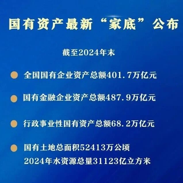 国有资产规模概况(截至2024年底) - 全国国有企业(不含金融企业)资产总额达401.7万亿元,国有资本权益为109.4万亿元 [1][4] - 国有金融企业资产总额达487.9万亿元,国有金融资本权益为33.9万亿元 [1][4] - 行政事业性国有资产总额为68.2万亿元,净资产为55.4万亿元 [1][4] - 国有土地总面积达52413万公顷,2024年水资源总量为31123亿立方米 [1][4] 国有企业(不含金融企业)五年增长趋势 - 过去5年,全国国有企业资产总额年均增长11.4%,负债总额年均增长11.7%,国有资本权益总额年均增长11.0% [1] - 国有企业资产负债率持续保持在65%以内 [1] 资产管理和改革方向 - 健全国资国企管理监督体制机制,完善中国特色现代企业制度,强化国有金融资本产权管理以提升金融服务实体经济质效 [2] - 下一步将深化国资国企改革,高质量完成国有企业改革深化提升行动,优化国有经济布局结构,并以新型举国体制推进科技创新 [2] - 未来将完善国有金融资本管理体制,提升行政事业性国有资产管理水平,健全自然资源资产管理制度体系 [2]