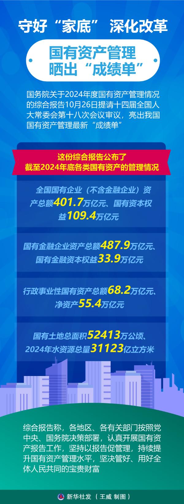 国务院关于2024年度国有资产管理情况的综合报告26日提请十四届全国人大常委会第十八次会议审议, 亮出我国国有资产管理最新"成绩单"。 这份综合报告公布了截至2024年底各类国有资产的管理情况: 此外,下一步,还将完善国有金融资本管理体制,提升行政事业性国有资产管理水平,健全自然资源资 产管理制度体系,全面提升国有资产报告质效。 国有资产是全体人民的共同财富,必须管好用好。综合报告称,坚持以国有资产报告工作为抓手,全面 摸清国有资产家底、盘活存量资源资产、提升管理效能,推动国有资产治理开创新局面、迈上新台阶。 ——全国国有企业(不含金融企业)资产总额401.7万亿元、国有资本权益109.4万亿元; ——国有金融企业资产总额487.9万亿元、国有金融资本权益33.9万亿元; ——行政事业性国有资产总额68.2万亿元、净资产55.4万亿元; ——国有土地总面积52413万公顷、2024年水资源总量31123亿立方米。 综合报告称,各地区、各有关部门按照党中央、国务院决策部署,认真开展国有资产报告工作,坚持以 报告促管理,持续提升国有资产管理水平,坚决管好、用好全体人民共同的宝贵财富。 国务院关于2024年度企业国 ...