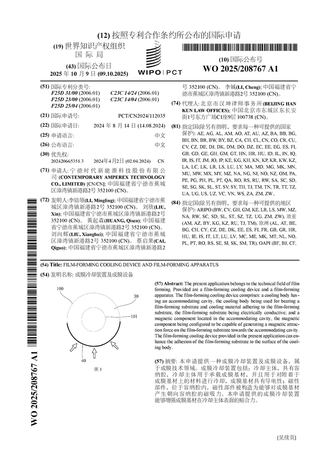 宁德时代公布国际专利申请:“成膜冷却装置及成膜设备”