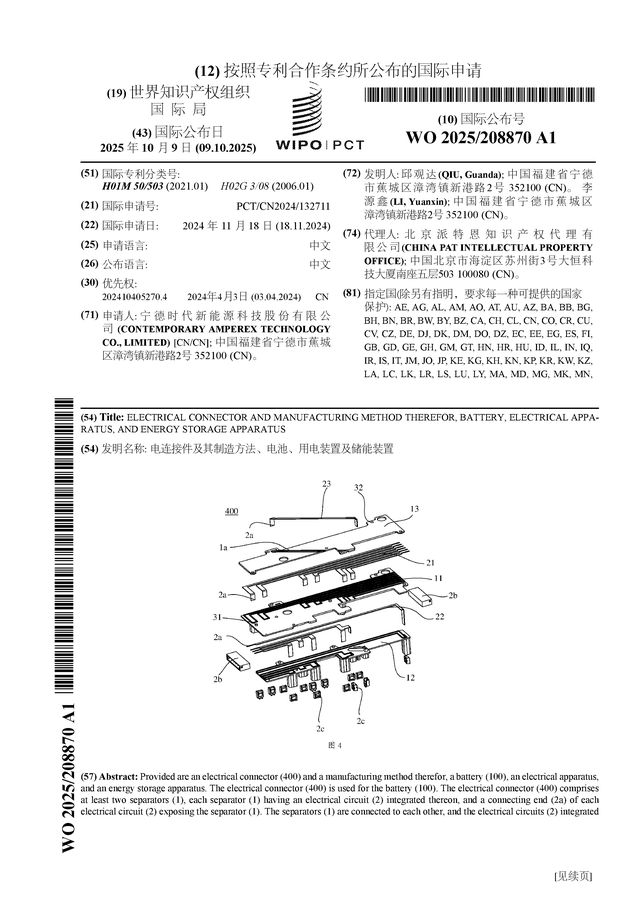 宁德时代公布国际专利申请:“电连接件及其制造方法、电池、用电装置及储能装置”