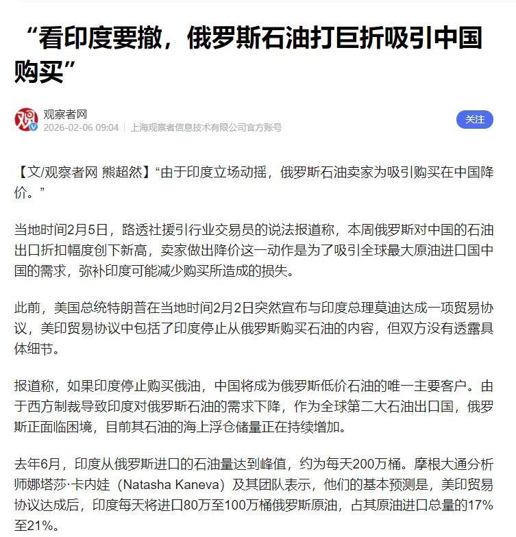 俄罗斯石油折扣与市场动态 - 俄罗斯石油折扣力度再创新高 本周折扣扩大至每桶近9美元 创近年来最大降幅[1][3] - 俄罗斯大幅降价的核心目的是弥补印度停止采购后造成的收入缺口[1] - 原本专供印度的石油品种 每桶优惠达12美元 且未来可能进一步下调[3] 印度停止采购的起因与影响 - 2月2日美高层与印度总理莫迪签署贸易协议 规定印度将停止采购俄罗斯石油[5] - 作为交换 美方将降低印度出口商品关税并取消此前加征的额外关税[5] - 印度国内石油资源匮乏 90%依赖进口 此前选择俄罗斯石油是因其价格优势[5] - 印度此举本质是为了追求经济利益最大化 权衡关税优惠后选择妥协[5] 对终端消费市场的影响 - 尽管俄罗斯石油价格持续走低 但对普通消费者影响不直接[7] - 汽柴油等成品油价格主要参考国际原油市场整体走势 调整滞后且幅度有限[7] - 即便俄罗斯原油价格便宜 普通消费者也难以直接感受到实惠[7]