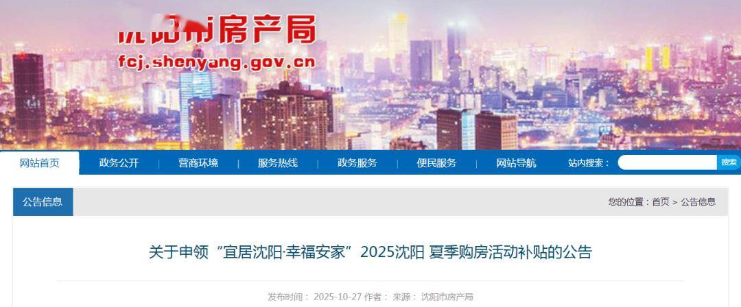 2025沈阳夏季购房活动,补贴可以领了! 近日,沈阳市房产局官网发布"关于申领"宜居沈阳·幸福安家"2025沈阳夏季购房活动补贴的公告"。 按照沈阳市房产局、沈阳市自然资源局《关于"宜居沈阳·幸福安家"2025沈阳夏季购房活动补贴发放工作分工与程序的通知》要求,即日起开始受理申领 工作,现将发放有关事项公告如下: 一、补贴对象与标准 2025年6月10日—6月30日,对个人购买2025沈阳夏季购房活动线下参展楼盘的商品住房(不含公寓),由政府给予100元/平方米补贴,金额共2000万元, 先购先得,发完即止。购房人在活动期间购买线下参展楼盘房源,签订《商品房买卖合同》(增加"2025沈阳夏季购房活动"水印),并完成网签备案,取 得《不动产权证书》后,方可申领购房补贴。符合补贴政策的购房人名单在"沈阳市房产局网站"中公示。自2025年6月9日公告发布之日起至6月30日活动 结束止,参展楼盘同一套商品住房,撤销此前网签备案,再次备案给家庭其他成员(含本人)的,不予发放购房补贴。 符合补贴政策的购房人名单详见公告。 二、申领流程 2025沈阳夏季购房活动补贴受理采用辽事通APP线上受理和不动产登记中心补贴窗口受理两 ...