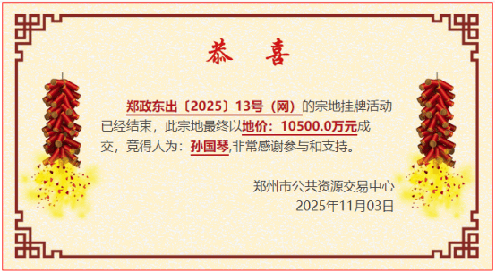11月3日,郑州5宗地块集中开拍。出让结果显示,3宗地块底价成交,1宗溢价成交,1宗提前终止挂 牌,总成交金额约7.14亿元。 从地块区域分布来看,5宗地块分布较为广泛,具体为郑东新区1宗、金水区1宗、管城回族区1宗、惠济 区1宗、上街区1宗。从地块性质来看,3宗为政府储备地,1宗为合村并城改造项目用地,1宗为城中村 改造项目用地。从土地用途来看,3宗为住宅用地,1宗为商业商务金融用地,1宗为公用设施营业网点 用地。 具体成交信息如下: 郑政东出〔2025〕13号(网)地块被孙国琴以10500万元摘得,溢价率达26.5%。 地块西侧为阳光城小区1号院,北侧为盛澳金尊府二期小区,东侧为盛澳金尊府小区。 郑政出〔2025〕19号(网)地块被郑州豫园实业有限公司以底价39014万元摘得。 该地块位于郑东新区顺兴北一街东、动力北路北,土地使用权面积7044.91平方米,土地用途地上为商 业商务金融用地,地下为商业设施,容积率<5.0,建筑密度<60%,建筑高度40-47米,绿地率>10%, 起始价8300万元。 该地块规划定位集高端酒店、国际会议交流中心、企业总部等功能为一体的产业项目。 值得注意的是,该地块位于郑州 ...