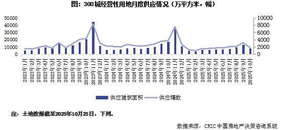 土地市场整体表现 - 10月全国经营性土地成交建筑面积6057万平方米,环比下降13%,同比下降25% [1][5] - 10月全国经营性土地成交金额1519亿元,环比减少20%,同比下降35% [1][5] - 10月土地市场平均溢价率为2.7%,创年内新低 [1][8] 土地供应情况 - 10月土地供应建筑面积8294万平方米,环比下降1%,同比下降34%,同比降幅较上月扩大25个百分点 [2] - 供应规模结束连续四个月的增长态势 [2] - 一线城市中北京、上海、广州均有住宅用地供应,上海第九次集中挂牌9宗宅地,出让底价169亿元 [2] 重点城市与地块成交 - 土地成交金额超过50亿元的城市仅上海和无锡2座,较上月减少4座 [5] - 成交建筑面积超过100万平方米的城市有重庆、盐城、淮安、连云港4座,较上月减少4座 [5] - 在成交总价超过10亿元的14宗宅地中,仅上海和杭州的3宗优质宅地实现溢价成交 [8] 市场热度与价格指标 - 受高能级城市成交占比下降影响,10月全国平均楼板价为2508元/平方米,环比下降8%,同比减少14% [5] - 市场热度呈现点状分布,仅上海、杭州等热点城市保持一定热度 [1][8] - 10月土地流拍率为5%,仍处于近年低位,流拍地块多位于远郊区域 [9]