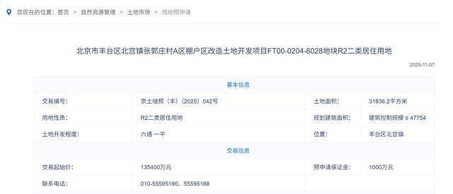 地块基本信息 - 地块为北京市丰台区北宫镇张郭庄村A区棚户区改造土地开发项目FT00-0204-6028地块R2二类居住用地 [1][2] - 交易起始价为13.54亿元人民币 [1][2] - 楼面价约为每平方米2.84万元人民币 [1] - 土地面积为31836.2平方米 [2] - 规划建筑面积不超过47754平方米 [2] - 容积率为1.5,限高24米(局部30米),属于低密度住宅用地 [2] - 土地开发程度为“六通一平” [2] - 地块已进入用地预申请阶段,受理时间截至12月8日下午17:00 [1] 地块位置与周边配套 - 地块位于丰台区北宫镇,永定河西地区,处于五环至六环之间 [3] - 邻近地铁14号线张郭庄站 [3] - 毗邻园博园 [3] - 周边有首联世纪生活广场、金瑞天霖等购物中心,生活配套较完善 [3] 交易与申请信息 - 交易编号为京土储预(丰)(2025) 042号 [2] - 预申请保证金为1000万元人民币 [2] - 联系咨询电话为010-55595190和010-55595188 [2]