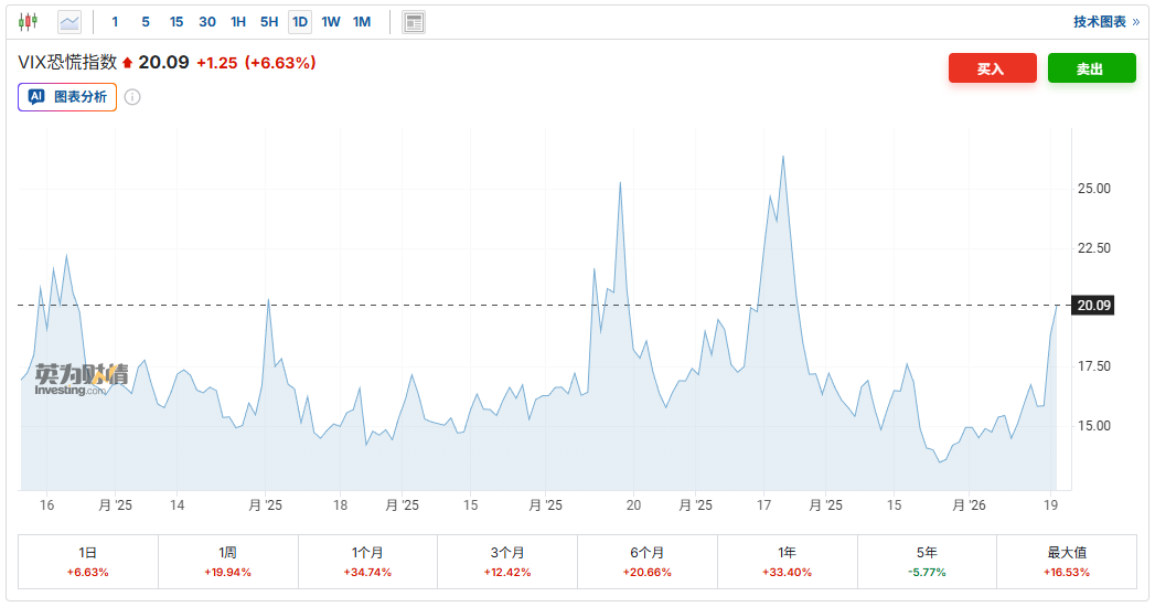 市场波动性显著上升 - 衡量市场预期波动性的Cboe波动率指数(VIX)强势突破20关键关口,升至近两个月最高水平,目前徘徊在20.69附近[1] - VIX指数较上周尾盘大幅走高,累计涨幅接近28%,标志着年初以来市场相对平静的阶段结束[1] 地缘政治与贸易紧张局势 - 地缘政治不确定性的再度升温是此次市场波动率飙升的核心原因[3] - 美国宣布将从2月1日起对来自丹麦、挪威、瑞典、法国、德国、英国、荷兰和芬兰的输美商品加征10%关税,并计划从6月1日起将税率提高至25%[3] - 欧盟考虑启用反胁迫工具或对价值930亿欧元的美国输欧商品加征关税进行反制[3][4] - 美国在格陵兰岛问题上的争议性举动引发外交紧张局势,并进一步动摇了投资者信心[5] 金融市场反应 - 美国三大股指周二全线收跌,道琼斯指数跌1.76%,标普500指数跌2.06%,纳斯达克指数跌2.39%[5] - 投资者转向避险资产,美元指数两个交易日大跌近1%,黄金、白银价格再创新高[5] - 现货黄金涨0.4%,报4783美元/盎司;现货白银涨0.7%,报95.28美元/盎司[5] 市场观点与后续展望 - 有观点认为股市面临的主要风险是地缘政治紧张局势,投资者应始终为头条新闻驱动的波动做好准备[3] - 市场正在思考此次事件是条件反射式抛售还是会产生更长期影响,有市场参与者表示尚未看到投资者大规模撤离的迹象[5] - 有分析认为,如果本周股市出现3%至5%的下跌,会感到意外[5]