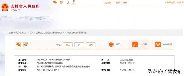 三、参保人员变更缴费档次的,按首次缴费标准享受补贴。参保人员补缴2024年及之前年度养老保险 费,选择缴费档次按原标准执行。 2025年12月31日,吉林省人民政府网站发布《吉林省关于调整城乡居民基本养老保险个人缴费标准的通 知》。具体如下: | | 9 6 0 5 | | | | 發表 注册 | | | 中国政府网 品群号 | | --- | --- | --- | --- | --- | --- | --- | --- | --- | | 吉林省人民政府 | | | | | | | | | | IL:GOV.CN | | | | | | | | | | 一一个人 一个人 | | | | | | | | | | 吉林省政府信息公开专栏 >> 古林省人力资源和社会经购厂>> 政府信息公开总结平台 | | | | | | | | | | | 字号: 大 | 双人人 | 18大 | | ilto | pdf下载 | VV | word下载 | | 费 引 号: | 1122000013544525W/2025-02541 | | | ਲੇ 炭: | 杜会保险通知 | | | | | 发文机关: 吉林省人力资源和社 ...