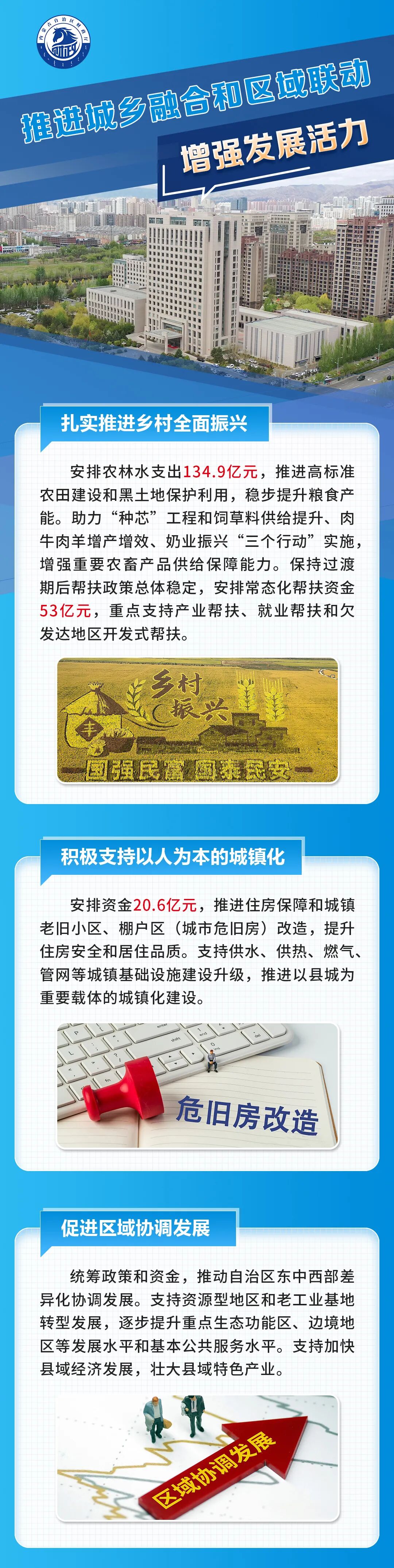 财政资金支持乡村振兴 - 安排农林水支出134.9亿元,用于推进高标准农田建设、黑土地保护利用以稳步提升粮食产能[11] - 安排资金支持“种芯”工程、饲草料供给提升、肉牛肉羊增产增效及奶业振兴“三个行动”,以增强重要农畜产品供给保障能力[11] - 保持过渡期后帮扶政策总体稳定,安排常态化帮扶资金53亿元,重点支持产业帮扶、就业帮扶和欠发达地区开发式帮扶[3][11] 财政资金支持城镇化建设 - 安排资金20.6亿元,推进住房保障和城镇老旧小区、棚户区(城市危旧房)改造,以提升住房安全和居住品质[5][13] - 支持供水、供热、燃气、管网等城镇基础设施的建设和升级[5][13] - 推进以县城为重要载体的城镇化建设[5][13]