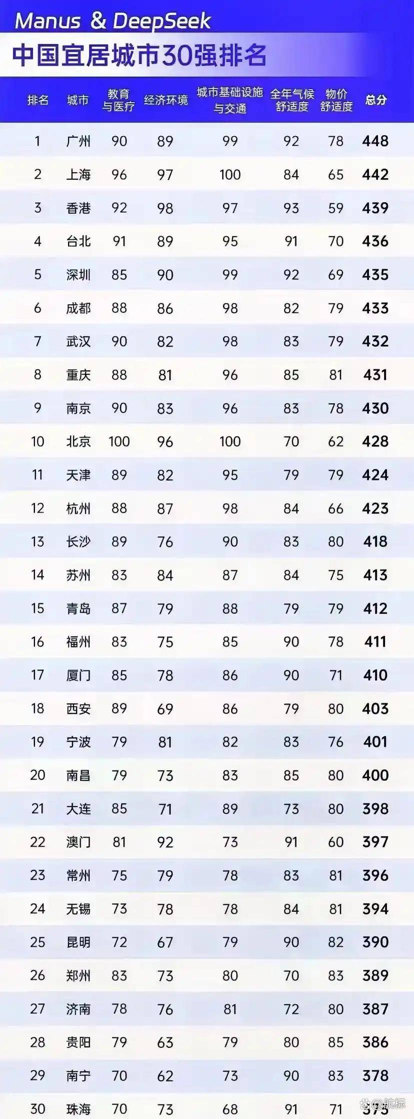 榜单总体排名 - Manus DeepSeek发布中国宜居城市30强榜单,广州以总分448分位列第一[1] - 上海以442分排名第二,香港以439分排名第三[2] - 榜单评分维度包括教育与医疗、城市基础设施、全年气候与交通、新道度、物价舒适度[2] 广州的领先优势 - 广州在总分上领先第二名上海6分,其城市基础设施与交通维度获得99分的高分[2] - 广州在物价舒适度方面获得78分,高于北京(62分)和上海(65分)[2][3] 上海的城市特征 - 上海在教育与医疗维度获得96分,经济环境获得97分,城市基础设施获得满分100分[3] - 上海在全年气候舒适度方面得分84分,物价舒适度得分65分,显示出高生活成本的特点[3] 南京的宜居模式 - 南京以总分430分排名第9,教育医疗得分90分,基建得分96分[3] - 南京经济环境得分83分,物价舒适度得分78分,体现了生活感与事业平衡的特点[3] 宁波与澳门的对比分析 - 宁波以401分排名第19位,超过经济实力更强的澳门(397分,排名第22位)[5] - 澳门在经济维度得分92分,远超宁波的81分,但基建与交通仅得73分,物价舒适度仅得60分[5] - 宁波在气候舒适度得83分,物价舒适度得76分,凭借均衡性在宜居榜上胜出[5] 城市宜居内涵解读 - 不同城市呈现出多元的宜居模式,上海代表高能级配套,南京体现稳平衡,宁波展现烟火气[7] - 宜居定义呈现多棱镜特点,涵盖硬实力、慢节奏和踏实感等多个维度[7]