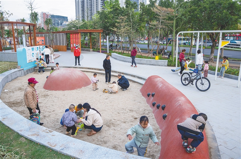 海口一处"口袋公园",家长陪同孩子玩乐。海南日报全媒体记者 李天平 摄 海南日报全媒体记者 袁宇 2025年省级民生实事项目 "口袋公园"建设 (海南日报海口1月21日讯) 书香口袋公园设计十分精巧,公园内随处可见充满书香气息的标识、雕塑,配备了可供老人锻炼、儿童 娱乐的健身休闲设施。 "作为省人大代表,我被邀请参加了很多与民生实事相关的调研、座谈,结合我的工作经历,可以说是看 着这座'口袋公园'建起来的。"彭红莲说,书香口袋公园以书香文化为特点打造,"像它这样,2025年建设 的'口袋公园'都各有特点,按照'一园一品'打造,实现功能与品质兼具。" 据介绍,在"口袋公园"建设过程中,相关职能部门组建了省内外园林专家团把脉问诊,同时通过问卷调 查、社区座谈等方式收集市民建议,精准融入适老适儿设施,把民生温度融入城市生态肌理。 彭红莲从事环卫工作已有17年,始终坚守在一线。从垃圾散落的背街小巷到干净整洁的椰风步道,她保 存的海口街景对比图,展现了城市的蜕变过程。 "我对民生事业的发展感受是非常深刻的。"彭红莲说,这些年城市日新月异,人民生活水平与城市宜居 质感持续提升,"环卫工作作为城市管理的基石,与"口袋公园" ...