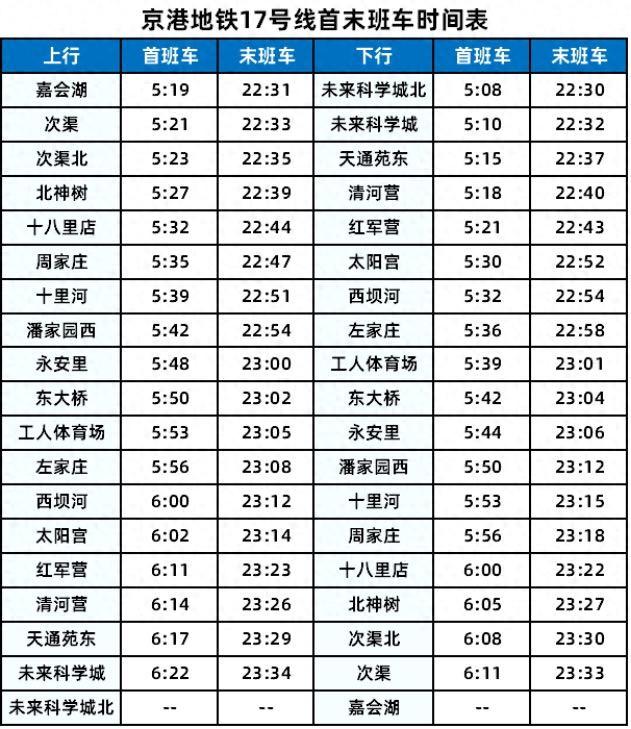 转自:北京日报客户端 京港地铁17号线中段将于2025年12月27日(星期六)开通,17号线中段共设4座车站,自北向南依次为 东大桥站、永安里站、广渠门外站(暂缓开通)和潘家园西站。其中,东大桥站可与6号线换乘,永安 里站可与1号线换乘。17号线中段开通后,17号线将实现全线贯通。 | 上行 | 首班车 | 未班车 | 下行 | 首班车 | 末班车 | | --- | --- | --- | --- | --- | --- | | 嘉会湖 | 5:19 | 22:31 | 未来科学城北 | 5:08 | 22:30 | | 次渠 | 5:21 | 22:33 | 未来科学城 | 5:10 | 22:32 | | 次渠北 | 5:23 | 22:35 | 天通见东 | 5:15 | 22:37 | | 北神树 | 5:27 | 22:39 | 清河营 | 5:18 | 22:40 | | 十八里店 | 5:32 | 22:44 | 红军营 | 5:21 | 22:43 | | 周家庄 | 5:35 | 22:47 | 太阳宫 | 5:30 | 22:52 | | 十里河 | 5:39 | 22:51 | 西坝河 ...