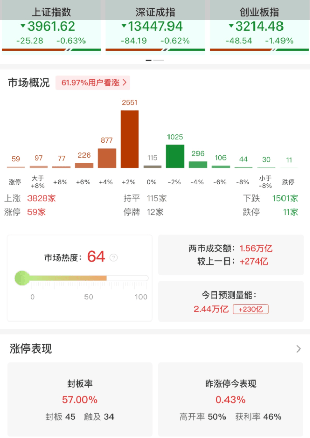 A股主要指数今日集体下跌,截至收盘,沪指跌0.81%报3954点,深证成指跌1.14%,创业板指跌2.31%,科创50指数跌3.13%。全市场成交额2.35万亿元,较 前一交易日缩量1145亿元,超3700股上涨,逾1500股下跌。 | 上证指数 | 深证成指 | 北证5( | | --- | --- | --- | | 3954.79 | 13378.21 | 1582.7 | | -32.11 -0.81% -153.91 -1.14% +29.40 +1 | | | | 科创20 | 创业板指 | 万得全/ | | 1415.53 | 3187.53 | 6346.6 | | -45.77 -3.13% -75.49 -2.31% -33.24 -0 | | | | 沪深300 | 中证500 | 中证A5( | | 4640.67 | 7331.00 | 5583.7 | | -69.24 -1.47% -54.71 -0.74% -70.02 -1 | | | | 中证1000 | 中证2000 | 中证红和 | | 7506.67 | 3103.74 | 5627.6 | | +21.59 +0. ...