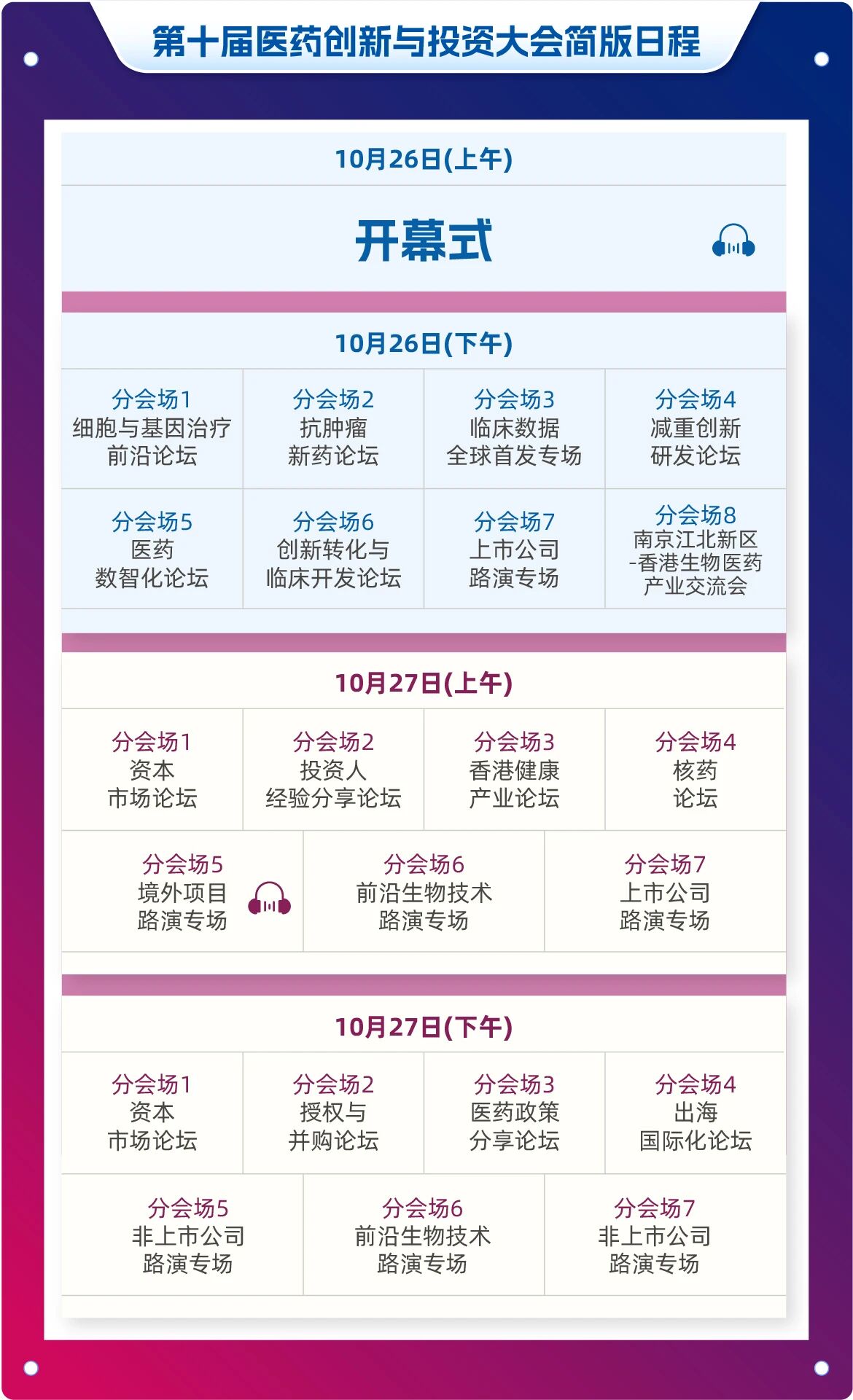 8:30-8:35 主持人:冯 岚 中国医药创新促进会驻会副会长 8:35-8:40 南京领导致辞 1 十年征程,创新永续,10月26-27日,第十届医药创新与投资大会将于南京丰大国际大酒店盛大举行。终版日程今日正式发布,汇集医药创新与投资领域的 顶尖智慧,关注全球医药研发最新动态,聚力共赢,共启新程。 市场论坛 并购论坛 分享论坛 国际化论坛 分会场7 分会场5 分会场6 前沿生物技术 非上市公司 非上市公司 路演专场 路演专场 路演专场 第十届医药创新与投资大会开幕式 第一阶段 致辞 8:40-8:45 任晋生 中国医药创新促进会副会长 / 先声药业集 有限公司董事长兼首席执行官 8:45-8:50 陈翊庭 香港交易所集团行政总裁 ● 10-26 AM 1 1 1 第二阶段 主旨报告 主持人:单国洪 中国医药创新促进会副会长候进 百济神州全球高级副总裁,大中华区、中亚及南 总经理 8:50-9:20 创新药物研发国家科技重大专项的战 1 考与实施路径 报告人:曹雪涛 第十四届全国政协教科卫体委员 副主任、中国工程院院士、创新药物研发国家科: 专项技术总师 9:20-9:50 病原体与大健康 报告人:饶子和 ...