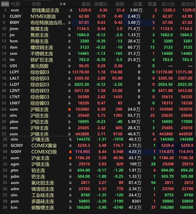 来源:上海有色网 金属市场: 截至日间收盘,内盘基本金属普涨,仅沪铅和沪镍一同下跌,沪铅跌0.23%,沪镍跌1.31%。沪铝以高 达5.75%的涨幅领涨,盘中一度上探至25680元/吨,刷新其上市以来的历史新高;沪锌、沪锡一同涨逾 2%,沪锌涨2.42%,沪锡涨2.11%。氧化铝主连涨3.27%,铸造铝主连涨3.35%,盘中最高冲至24090元/ 吨,同样刷新其上市以来的历史新高。 此外,碳酸锂主连跌3.9%,多晶硅主连跌2.29%,工业硅主连跌1.35%。欧线集运主连涨4.36%报1229。 黑色系方面集体下跌,不锈钢跌1.13%,其余跌幅均在1%以内。双焦方面,焦煤涨0.44%,焦炭跌 0.12%。 外盘方面,截至15:03分,外盘基本金属普涨,仅伦铅小幅下跌0.12%。伦铝涨2.89%,盘中最高冲至 3314美元/吨,刷新2022年4月以来的新高。伦锡涨2.62%,伦铜、伦锌一同涨逾1%,伦铜涨1.18%,伦 锌涨1.58%。伦镍小幅上涨0.47%。 贵金属方面,截至15:03分,COMEX黄金涨3.48%,盘中最高攀升至5264.4美元/盎司,继续刷新其上市 以来的历史新高;COMEX白银大涨8.44 ...