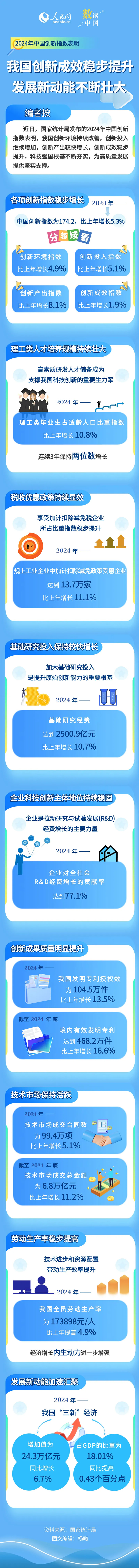 中国创新指数总体表现 - 2024年中国创新指数达174.2,比2023年增长5.3%,保持稳步增长态势 [3] - 在4个分领域的18个评价指标指数中,每万名R&D人员高价值发明专利拥有量指数、理工类毕业生占适龄人口比重指数等2个指标指数增速连续3年超过10% [3] 创新环境 - 2024年创新环境指数为186.0,比上年增长4.9%,该领域5个评价指标指数全部实现增长 [3] - 理工类毕业生占适龄人口比重指数比上年增长10.8%,连续3年保持两位数增长 [3] - 规模以上工业企业中研发费用加计扣除减免政策受惠企业达13.7万家,比上年增长11.1% [3] 创新投入 - 2024年创新投入指数为162.6,比上年增长5.1%,该领域4个评价指标指数全部实现增长 [3] - 我国基础研究经费达2500.9亿元,比上年增长10.7%,延续两位数以上较快增长势头 [3] 创新产出 - 2024年创新产出指数为215.8,比上年增长8.1%,是4个分领域中增长最快的领域,该领域4个评价指标指数全部实现增长 [4] - 截至2024年底,境内有效发明专利达到468.2万件,比上年增长16.6% [4] - 我国高价值发明专利拥有量达到197.8万件,占境内有效发明专利的42.2%,比重较上年提高0.7个百分点 [4] 创新成效 - 2024年创新成效指数为132.4,比上年增长1.9%,该领域的5个评价指标指数三升一平一降 [4] - 2024年我国全员劳动生产率为173898元/人,比上年提高4.9% [4] - 我国"三新"经济增加值为24.3万亿元,比上年增长6.7%,高于同期国内生产总值(GDP)现价增速2.5个百分点 [4]