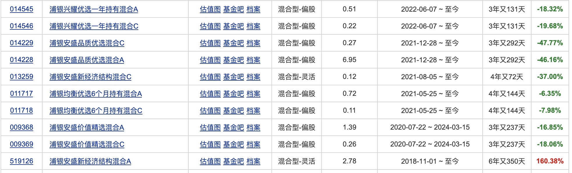 【文/羽扇观金工作室】 在公募基金行业总规模突破33万亿元、行业高速发展的今天,浦银安盛基金管理有限公司首席权益投资官蒋佳良管理的产品却并不尽人意。 截至最新数据显示,其管理的浦银安盛品质优选混合A自2021年12月成立以来亏损超过46%,近三年收益率-34.21%。值得注意的是,蒋佳良目前任职在管的 8只基金中7只任期回报为负,其中两只产品亏损近50%,这在近年结构性牛市行情中显得格外刺眼。 | 014545 | 浦银兴耀优选一年持有混合A | 估值图 基金吧 档案 | 混合型-偏股 | | --- | --- | --- | --- | | 014546 | 浦银兴耀优选一年持有混合C | 估值图 基金吧 档案 | 混合型-偏股 | | 014229 | 浦银安盛品质优选混合C | 估值图 基金吧 档案 | 混合型-偏股 | | 014228 | 浦银安盛品质优选混合A | 估值图 基金吧 档案 | 混合型-偏股 | | 013259 | 浦银安盛新经济结构混合C | 估值图 基金吧 档案 | 混合型-灵活 | | 011717 | 浦银均衡优选6个月持有混合A | 估值图 基金吧 档案 | 混合型-偏股 ...