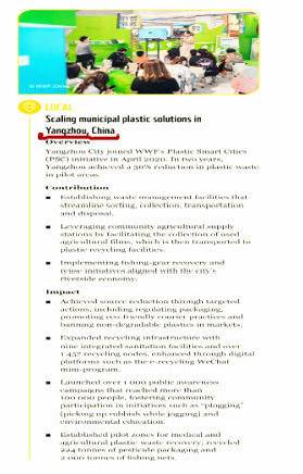 记者了解到,世界自然基金会(WWF)充分肯定了扬州作为"净塑城市"作出的突出贡献,包括"建立生 活垃圾管理设施,优化分类、收集、运输与处置的全流程;依托社区农资供应站,协助回收废旧农膜, 随后将其运往塑料回收设施处理;实施渔具回收与再利用举措,与城市的长江经济带发展相适配"等。 与此同时,世界自然基金会(WWF)高度认可了扬州取得的系列成效:"通过针对性行动实现源头减 量,包括规范包装、推广环保快递模式,以及在农贸市场禁用不可降解塑料;扩建回收基础设施,新增 9处再生资源绿色分拣中心和超过1457个回收点,并通过微信小程序等数字平台提升效率;开展超过 1000场公众宣传活动,覆盖超10万人,推动社区参与plogging(捡拾慢跑)等活动和环境教育;设立医 疗与农业塑料垃圾回收试点区域,回收了224吨农药包装和2000吨渔网"。 扬子晚报网11月18日讯(通讯员 扬城管 记者 陈咏)记者18日从扬州获悉,世界自然基金会(WWF) 最新出版《"净塑自然"倡议 2019-2024年影响力报告:推动系统性变革,全球携手应对塑料污染》,报 告说,"扬州市于2020年4月加入世界自然基金会(WWF)的'净塑城市(PSC) ...