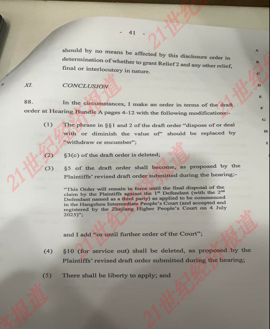 21世纪经济报道记者张伟泽 实习生王艺之 香港报道 8月1日,21世纪经济报道记者从香港高等法院新闻及公共关系组获得宗庆后遗产纠纷案判决书复印件。该复印件罗列了当事双 方的证据,公开了信托设立等相关细节。根据文件,被告作为设立人在境外设立了3个境外信托而并非此前所传的1个。在结论 处,法官针对一份现有的法律命令草案进行细化和调整。 宗庆后"(emphasis added) 1. On about 2 February 2024, Zong Senior executed a document ntitled "委托書" dated 2 February 2024 (the "Letter of Entrustment"). This is the second document the Plaintiffs rely on. It stated that :- "委托书 甲方:宗庆后("委托人") 乙方:宗馥莉(Zong,Kelly Fuli)("受托人") 鉴于: 1. Jian Hao Ventured Limit (建浩創投有限公司)为一家根 据 BVI 法律注册成立的公司 ... 公司经登记的股东为乙 ...