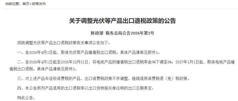 政策调整核心内容 - 自2026年4月1日起,取消光伏等产品增值税出口退税 [1] - 自2026年4月1日至2026年12月31日,电池产品增值税出口退税率由9%下调至6% [1] - 自2027年1月1日起,取消电池产品增值税出口退税 [1] 政策执行细节 - 政策所列产品适用的出口退税率以出口货物报关单注明的出口日期界定 [1] - 对上述产品中征收消费税的产品,出口消费税政策不作调整,继续适用消费税退(免)税政策 [1]