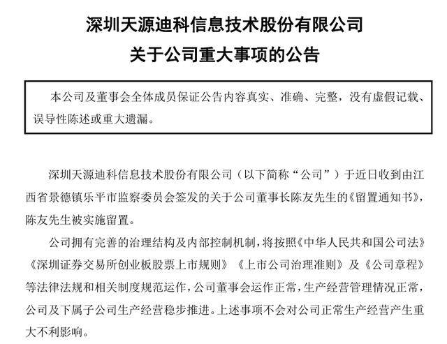 核心事件 - 公司董事长兼总经理陈友被江西省景德镇乐平市监察委员会实施留置 [1] - 公司表示截至公告日未知悉事项进展及结论 将持续关注并履行信息披露义务 [3] - 公司声称其拥有完善的治理结构及内控机制 董事会运作及生产经营管理情况正常 [3] 公司管理层信息 - 陈友自2007年4月起担任公司董事长 并于2023年3月起兼任总经理 [3] - 陈友于1986年毕业于武汉大学计算机系 1989年获中国科技大学计算机系硕士学位 2000年获MBA学位 [3] 公司财务表现 - 2023年及2024年公司营收均增长超10% 但归母净利润分别同比减少13.06%和18.10% 呈现增收不增利情况 [3] - 2024年前三季度公司实现营收63亿元 同比增长12.44% 归母净利润为3860.3万元 同比增长19.75% [3] - 2024年第三季度公司扣非净利润由盈转亏 亏损566.34万元 [3] 公司基本情况 - 公司成立于1993年 于2010年1月20日在创业板上市 [4] - 公司从事行业软件开发 业务布局为软件和信息技术服务、ICT产品销售及增值服务双轮驱动 [4] - 公司目前拥有9家全资子公司及8家控股子公司 [4]