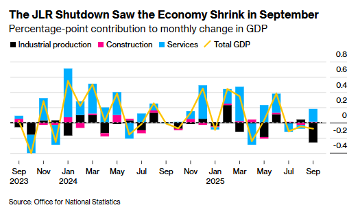 英国第三季度经济增长概况 - 英国第三季度国内生产总值(GDP)仅增长0.1%,低于第二季度的0.3%和预期的0.2% [1] - 9月单月经济收缩0.1%,服务业微弱增长0.2%被制造业急剧下滑所抵消 [1][7] - 英国经济在经历上半年领跑七国集团(G7)后回归缓慢增长节奏 [3] 经济增长放缓原因分析 - 9月捷豹路虎遭遇网络攻击导致停产逾五周,汽车制造业产出暴跌近30%,拖累当月GDP 0.17个百分点 [1][7] - 市场对工党政府预算案中可能加税的担忧导致消费者和企业推迟支出决策 [1][3] - 英国对美商品出口下降11.4%至2022年1月以来最低水平,化学品出口减少3亿英镑,机械及运输设备出口下降1亿英镑 [8][9] 行业表现差异 - 9月制造业产出整体下降1.7%,工业产出下滑2% [7] - 服务业产出环比增长0.2%,得益于商业租赁、现场活动和零售销售的强劲表现 [7] - 7月至9月期间家庭和政府支出仅小幅增长,企业投资连续第二个季度下滑 [5] 政策与市场影响 - 疲软经济增长和失业率升至疫情以来最高水平加大市场对英国央行降息押注,预计下个月降息可能性超过80% [5] - 财政大臣面临数十亿英镑赤字,可能违背选举承诺推行大范围增税 [5] - 预算案中的增税措施可能导致2026年GDP减少约0.2% [3]