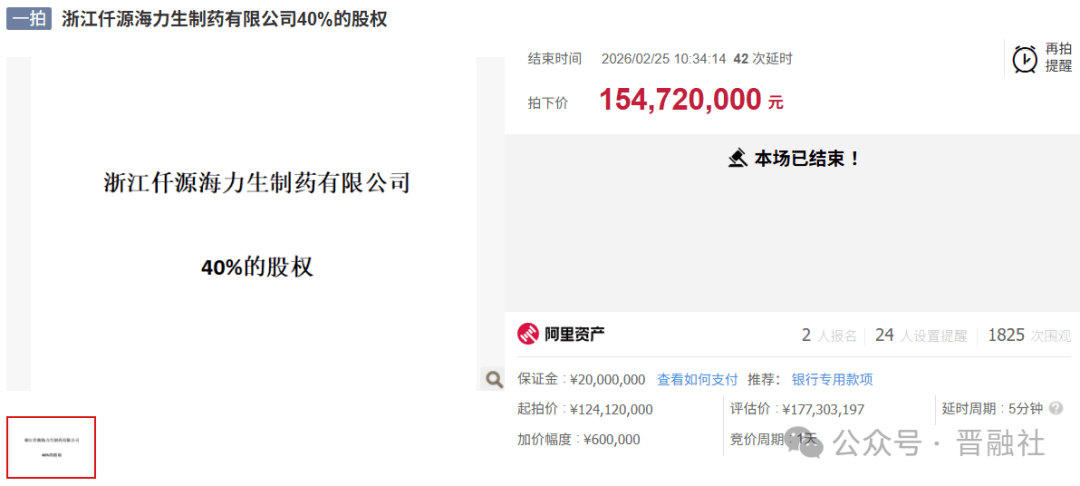 交易核心信息 - 仟源医药与舟山荣豪联合体以1.55亿元竞得仟源海力生40%股权 [1] - 仟源医药出资7736万元获得20%股权,舟山荣豪出资7736万元获得另外20%股权 [1] - 交易完成后,仟源医药对仟源海力生的持股比例从60%增至80%,舟山荣豪持股20% [1][2] - 该笔股权原由海力生集团持有,因其债务问题被法院强制拍卖,评估价1.77亿元,起拍价1.24亿元 [1][2] - 仟源医药董事会授权经营层以不超过8000万元自有资金参与拍卖,实际出价在授权范围内 [2] 标的公司(仟源海力生)概况 - 公司前身为创建于1989年的浙江省普陀山制药厂,以生产天然海洋药物、天然矿产药物和化工合成药物为主 [3] - 2024年实现营业收入3.09亿元,净利润4836.25万元;2025年1-9月实现营业收入2.26亿元,净利润4807.08万元,前三季度净利润已接近2024年全年水平 [4] - 截至2025年9月30日,公司资产总额为3.89亿元,所有者权益为2.66亿元 [4] - 核心产品包括占据全国约20%市场份额的原料药“盐酸氨基葡萄糖”、国内首家上市的维生素AD滴剂“贝特令”及仿制药“齐索” [6] - 公司建有海洋药物研发中心,拥有40余人研发团队,2025年研发投入约1200万元 [6] 交易方背景与交易动机 - 仟源医药早在2012年即计划收购仟源海力生,并于2014年以1.65亿元完成收购其60%股权,实现控股 [6] - 联合竞买方舟山荣豪系原海力生集团管理团队控股公司,非常了解仟源海力生经营状况并看好其发展 [6] - 交易有助于优化仟源海力生股权结构,并因交易方的特殊背景,有利于维持核心团队稳定及经营战略的连贯性 [6] - 提升对仟源海力生的持股比例,有助于进一步提升仟源医药整体经营业绩与盈利水平,增强公司可持续发展能力与综合竞争力 [10] 收购方(仟源医药)战略与业务 - 公司是一家集研发、生产、营销为一体的医药上市企业,2011年于深交所创业板上市 [8] - 发展战略为“双轮驱动”:一方面通过外延并购夯实传统主业,另一方面积极向高技术壁垒的创新药领域进军 [8] - 近期并购案例包括收购保灵集团、以及于2024年9月以2.64亿元收购江苏嘉逸医药36%股权,交易后合计控制嘉逸医药87%股权 [8] - 在创新药领域,2024年3月出资7200万元(持股60%)与北京亿药科技成立合资公司“仟源亿药”,基于AI技术打造创新药研发平台,已启动抗衰老及减肥2条管线研究 [8] - 集团旗下拥有10家全资和控股子公司,2025年第三季度对联营企业的投资收益为146.94万元,较上年同期增长61.95% [9]