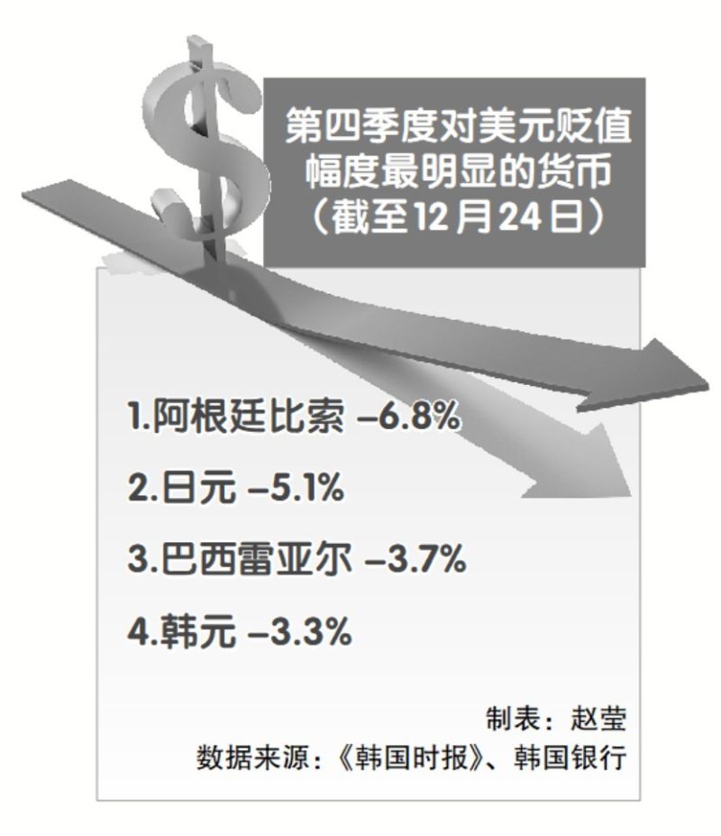 《韩国时报》援引韩国银行数据报道称,截至24日,尽管当局多次发声干预以抑制汇率波动,韩元仍是全球表现 第五弱的货币。 编者的话:近期,一阵"危机感"正在韩国蔓延开来。今年以来,韩元持续走弱,对美元汇率一度逼近1500韩元兑 换1美元这一关键心理关口,该汇率水平仅在1997年亚洲金融危机和2008年全球金融危机期间出现过。市场不安情 绪加剧,相关局面被部分韩国市场人士解读为"第三次外汇危机的前兆"。尽管韩国政府近期密集打出稳汇率"组合 拳"缓解跌势,但分析认为,韩元贬值压力仍未得到根本解决,潜在风险不容忽视,亟需改革经济结构。 放弃秘密行动,采取公开应对 据韩国《朝鲜日报》梳理,2025年上半年,韩元对美元汇率以1400韩元出头开局,在美国货币政策走向、韩国国 内政治局势及经济基本面等因素影响下,汇率长期在1400韩元区间高位震荡。进入7月后韩元对美元汇率在1350左 右,10月再度回升至1400韩元上方,12月23日盘中更是来到1485韩元附近,逼近2009年水平。 面对韩元持续承压,韩国政府近期加大调控力度。12月24日,韩国外汇当局发出口头警告,明确强调韩元不应过 度疲软。财政部同步公布税收支持方案,以提 ...