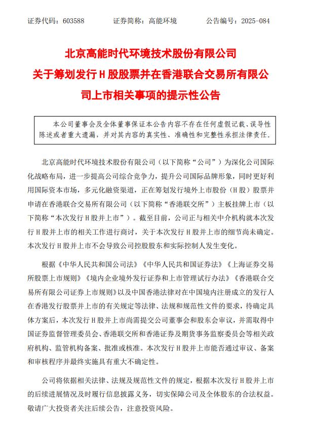公司战略规划 - 公司正在筹划发行H股并在香港联合交易所主板挂牌上市 以深化国际化战略布局 提高综合竞争力 提升国际品牌形象 并利用国际资本市场多元化融资渠道 [1] - 本次H股发行上市的具体细节尚未确定 相关工作正与中介机构商讨 且不会导致公司控股股东和实际控制人发生变化 [1] - H股发行上市方案尚需提交公司董事会和股东会审议 并需取得中国证监会 香港联交所等监管机构的备案 批准或核准 最终能否实施具有重大不确定性 [1] 公司业务与财务表现 - 公司是国内最早专业从事固废污染防治技术研究 成果转化和提供系统解决方案的国家高新技术企业 [3] - 公司主营业务分为三大板块:固废危废资源化利用 环保运营服务及环保工程 [3] - 公司2025年前三季度营业收入为101.6亿元 同比减少11.28% [3] - 公司2025年前三季度归属于上市公司股东的净利润为6.46亿元 同比增长15.18% [3] - 公司2025年前三季度归属于上市公司股东的扣除非经常性损益的净利润为6亿元 同比增长29.03% [3] - 公司2025年前三季度基本每股收益为0.424元 [3]