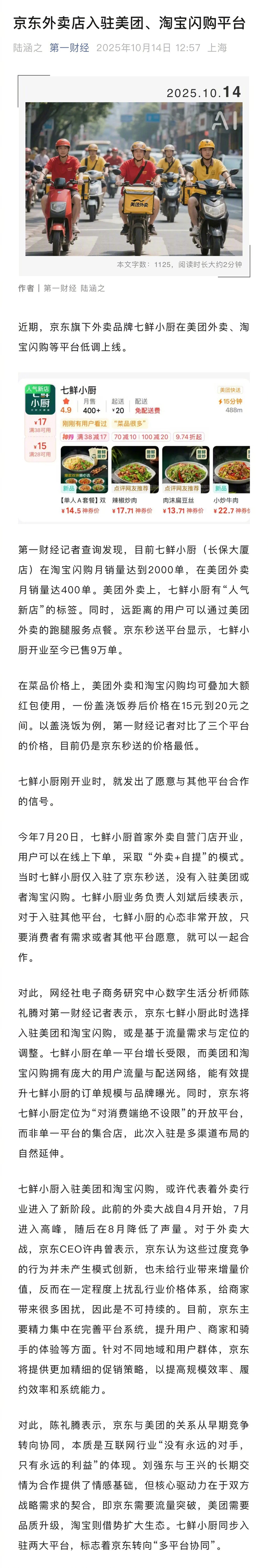 近期,京东旗下外卖品牌七鲜小厨在美团外卖、淘宝闪购等平台低调上线。 对此,陈礼腾表示,京东与美团的关系从早期竞争转向协同,本质是互联网行业"没有永远的对手,只有永远的利益"的体现。刘强东与王兴 的长期交情为合作提供了情感基础,但核心驱动力在于双方战略需求的契合,即京东需要流量突破,美团需要品质升级,淘宝则借势扩大生 态。七鲜小厨同步入驻两大平台,标志着京东转向"多平台协同"。(转载自第一财经) 七鲜小厨刚开业时,就发出了愿意与其他平台合作的信号。 今年7月20日,七鲜小厨首家外卖自营门店开业,用户可以在线上下单,采取 "外卖+自提"的模式。当时七鲜小厨仅入驻了京东秒送,没有 入驻美团或者淘宝闪购。七鲜小厨业务负责人刘斌后续表示,对于入驻其他平台,七鲜小厨的心态非常开放,只要消费者有需求或者其他平 台愿意,就可以一起合作。 对此,网经社电子商务研究中心数字生活分析师陈礼腾对第一财经记者表示,京东七鲜小厨此时选择入驻美团和淘宝闪购,或是基于流量需 求与定位的调整。七鲜小厨在单一平台增长受限,而美团和淘宝闪购拥有庞大的用户流量与配送网络,能有效提升七鲜小厨的订单规模与品 牌曝光。同时,京东将七鲜小厨定位为"对消费端 ...
