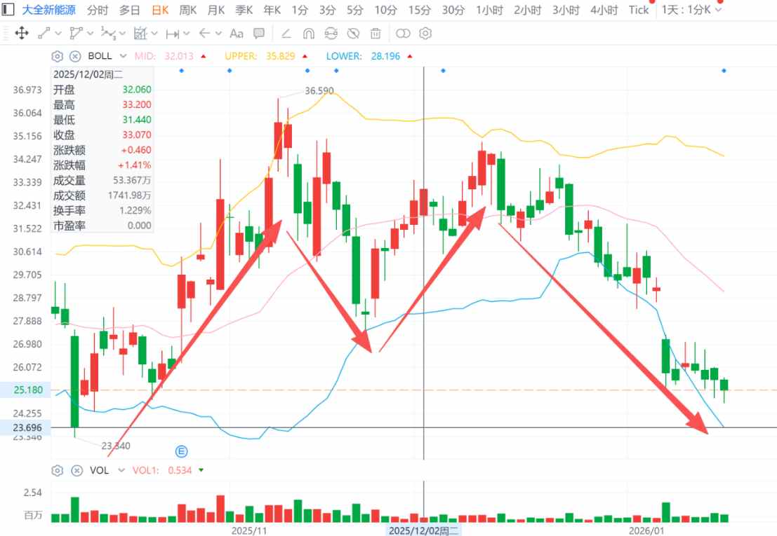 公司股价近期表现 - 大全新能源美股股价自2024年11月高点36.59美元跌至2025年1月15日收盘价25.59美元,区间跌幅达30% [1] - 公司股价在2024年5月至10月经历了一轮持续6个月的拉升行情,累计涨幅达到153.97% [1] - 2025年1月8日,公司股价单日大跌11.41% [7] 股价波动的核心驱动因素 - 股价走势与光伏行业“反内卷”政策进程及市场预期高度相关 [1] - 2024年5月,市场盛传将成立多晶硅收储联合体以淘汰约100万吨落后产能,刺激了包括大全新能源在内的光伏公司股价 [1] - 2024年7月3日光伏行业制造业座谈会召开,市场对整治无序竞争的预期加强,进一步推动股价上涨 [1] - 2025年1月上旬,监管层叫停行业“收储自律”操作,并宣布自4月1日起取消光伏产品增值税出口退税,导致股价承压 [2][7] 2025年第三季度财报表现 - 2024年10月27日公布25Q3未经审计财报后,股价当日拉升14% [4] - 公司25Q3经营现金流净额达到5552万元,为自2023年第四季度以来首次转正 [4] - 截至2024年10月底,晶硅产业链多数头部企业25Q3经营现金流净额转正,情况较前两季度大幅改观 [4] 市场情绪与技术面分析 - 2024年10月10日,股价大幅收跌14.52%,日成交量放大至283.60万股,显示有资金抄底进场 [4] - 25Q3财报发布当日成交量仅约200万股,低于此前水平,次日进一步下降,显示持筹者观望情绪 [4] - 股价在2024年11月10日触及BOLL线上轨后迅速回调,后续行情更多由技术面驱动,量能明显低于10月底的行情 [6] - 2024年12月9日,北京光和谦成科技有限责任公司注册成立,注册资本30亿元,股东包括通威、大全能源等,被市场视为多晶硅整合平台落地 [6] - 2024年12月12日至31日期间,仅2个交易日日成交量超过100万股,且均收跌超5%,显示场外承接力弱 [7] - 2025年1月8日后,BOLL线向下大幅开口,但随后5个交易日股价走出探底回升趋势 [8] 近期业绩与市场反应 - 2025年1月16日,公司发布2025年年度业绩预告,预计净亏损在10亿至13亿元之间,较2024财年27亿元的净亏损有所收窄 [8] - 业绩预告发布当日,股价早盘最大跌幅超过3%,但午后趋稳,最终收跌1.6% [8]