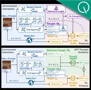 GTR-Turbo框架的核心演进 - 核心思想是从依赖外部教师模型的“寻求外援”模式,转变为利用自身历史检查点进行“内生进化” [6][7] - 通过融合训练过程中的历史检查点权重,构建出一个“免费且强大”的内部教师模型,为当前智能体提供步级思维引导 [4][7] - 该方法实现了零成本开销(无需昂贵外部API)、精准指导(贴合当前任务分布)和自适应进化(教师能力随智能体提升) [8][9][10] GTR-Turbo框架的具体流程 - 整体框架延续“思维+动作”联合训练思想,采用“SFT/OPD + RL”模式,以抑制“思维崩塌”现象 [11] - 设计了两种变体:SFT变体通过监督微调融入教师指导;KL变体采用标签蒸馏方式,训练效率更高 [11][15] - 训练中每完成一轮PPO更新即保存模型权重,通过SMA或EMA策略合并检查点以更新教师模型,形成自主的“教学相长”循环 [16] GTR-Turbo的实验性能与效率 - 在Points24卡牌游戏任务中,GTR-Turbo (KL变体)达到53.5%的成功率,相比GTR的44.5%取得近10%的巨大提升,并创下SOTA性能 [17][18] - 在复杂困难的ALFWorld具身智能任务中,GTR-Turbo仅依靠自身探索和思维引导,达到了与依赖外部知识的GTR相同的表现 [19] - 在训练效率上,GTR-Turbo最高可降低50%的训练时间和60%的成本开销,例如在P24任务中,KL变体训练时间从GTR的191小时降至89小时,成本估算从307.78美元降至114.81美元 [4][23][24] GTR-Turbo的行业意义与优势 - 该框架揭示了模型自身蕴含的自监督潜力,证明了通过权重融合机制可以实现“左脚踩右脚”式的性能跃升 [26] - 其闭环、可本地部署的训练模式,解决了依赖强大外部模型带来的可及性、成本及数据隐私问题,具备无法替代的泛用性优势 [4][25] - 为复杂长时任务中构建低成本、高效率的自主进化智能体提供了重要的启发和参考 [27]