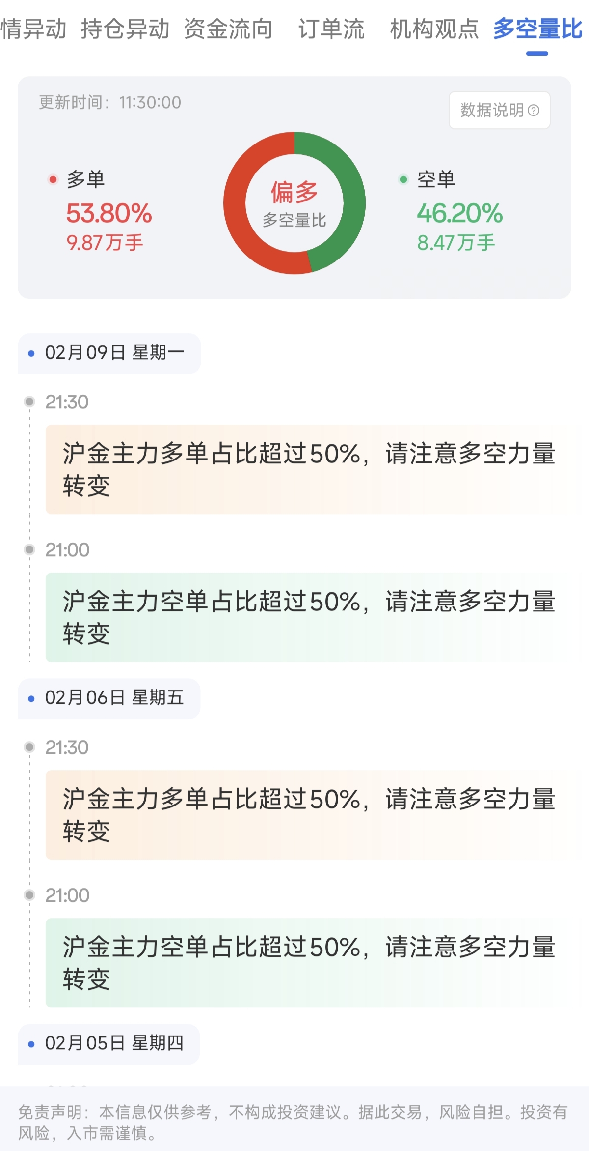 沪金期货市场交易数据 - 2026年2月10日北京时间11:30,沪金主力合约价格报1120.74元/克,日内上涨0.44% [1] - 同期沪金主力合约日内持仓增加1763手,涨幅为1.11% [1] - 市场多空量比数据显示,多单占比53.80%,共计9.87万手;空单占比46.20%,共计8.47万手 [1] 市场情绪分析工具 - 金投网APP天眼盯盘提供多空量比功能,通过分析品种多头与空头的真实成交数据,计算多空订单比 [4] - 该指标用于显示市场中的多空力量对比,帮助判断市场整体情绪和未来走势 [4] - 该功能具备实时监测能力,能迅速捕捉市场中多空订单的变化情况,及时提供多空力量变化信息 [4]